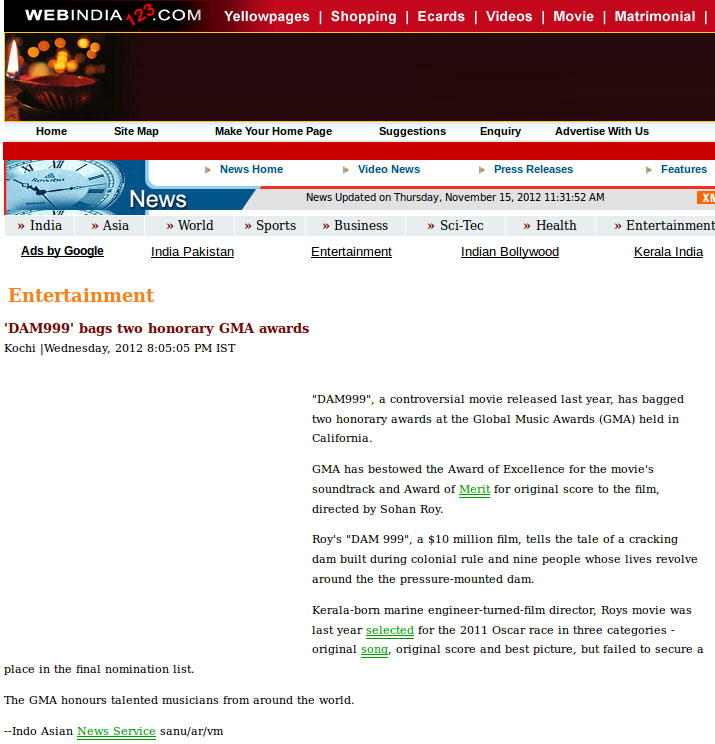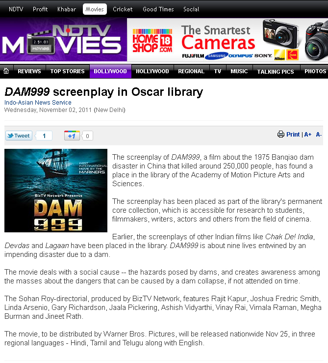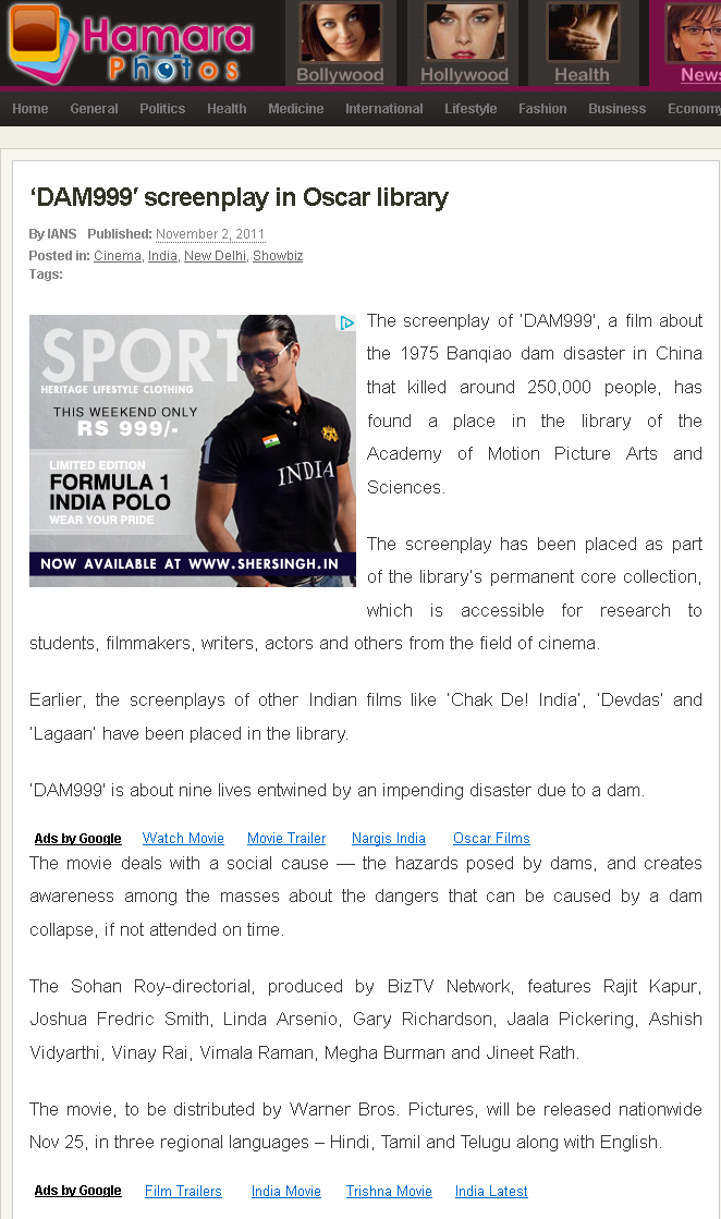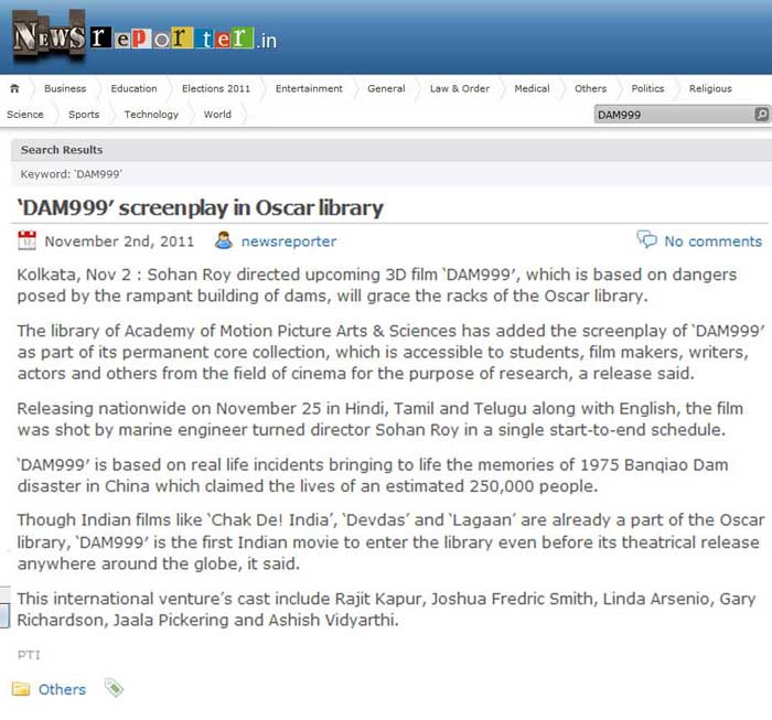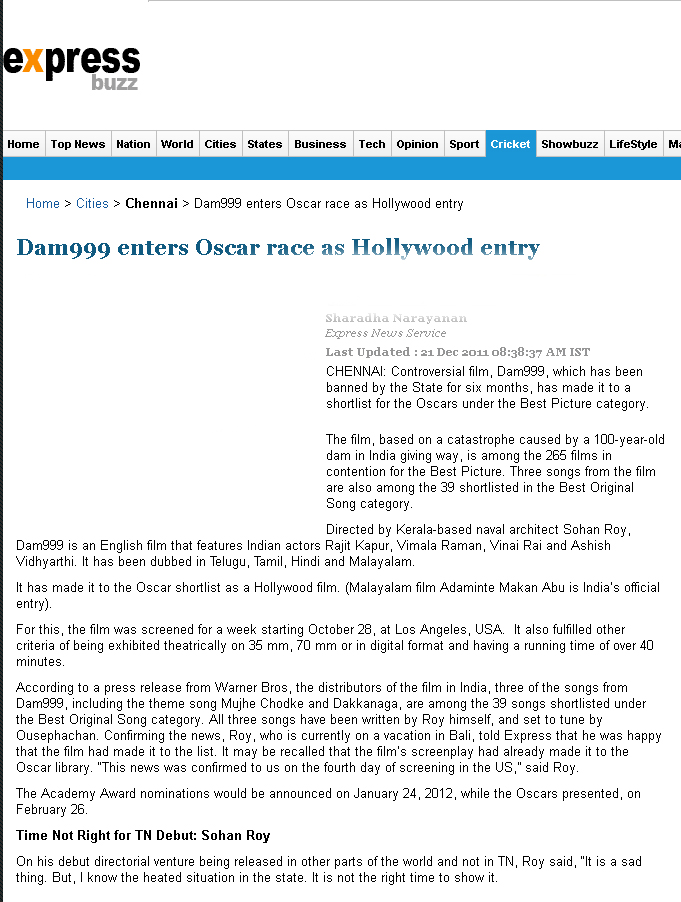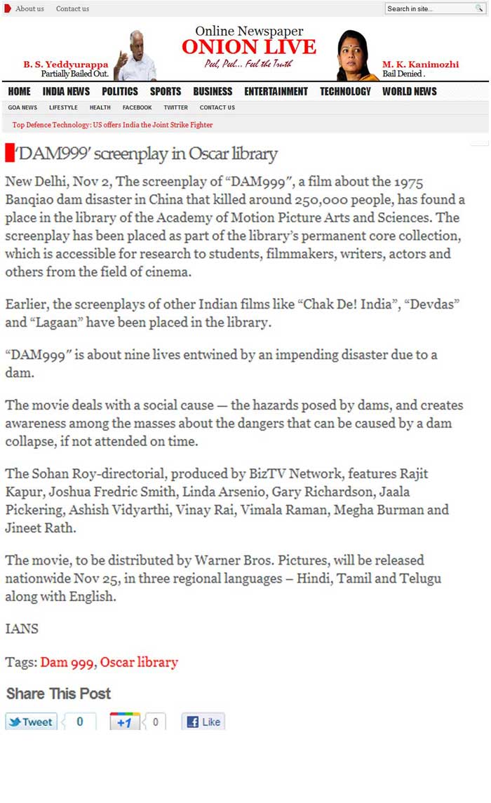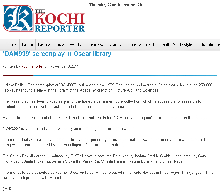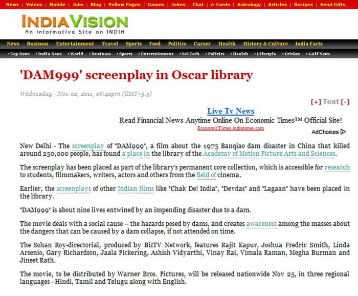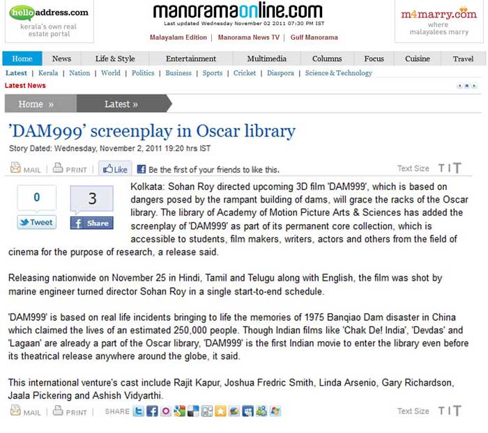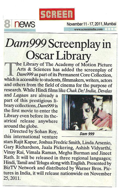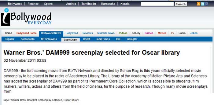 - DAM999' screenplay in Oscar library -Webindia123.com