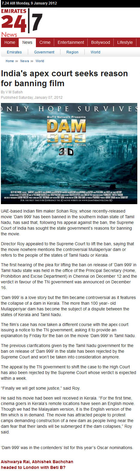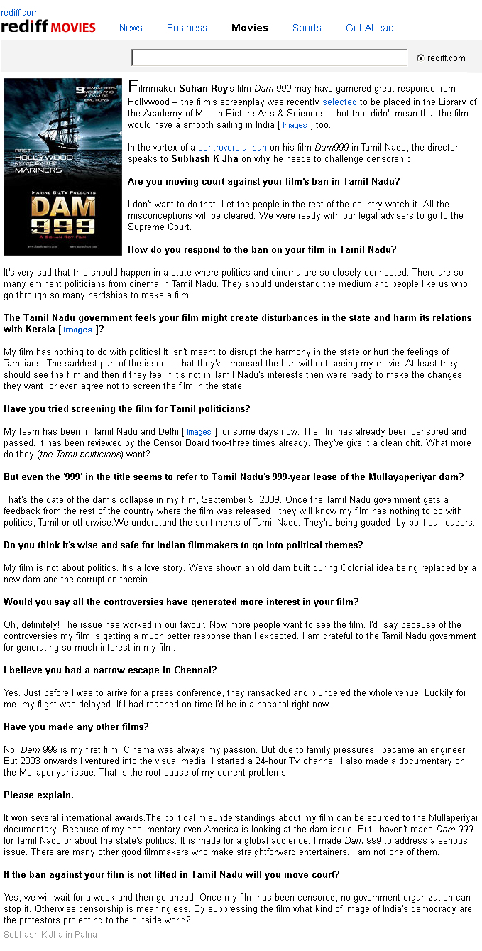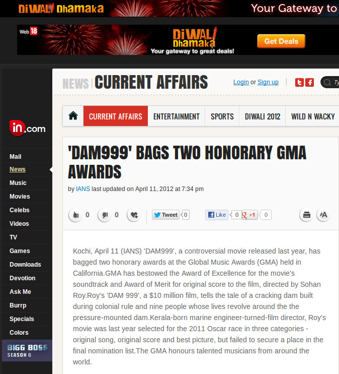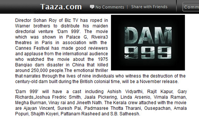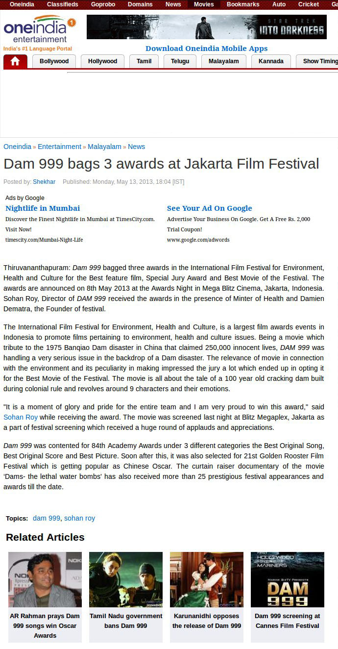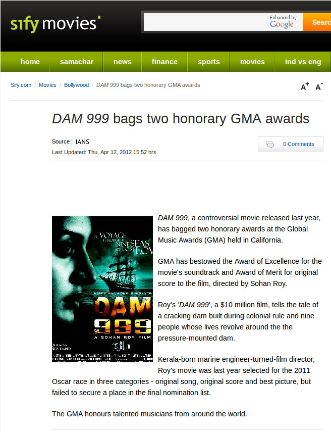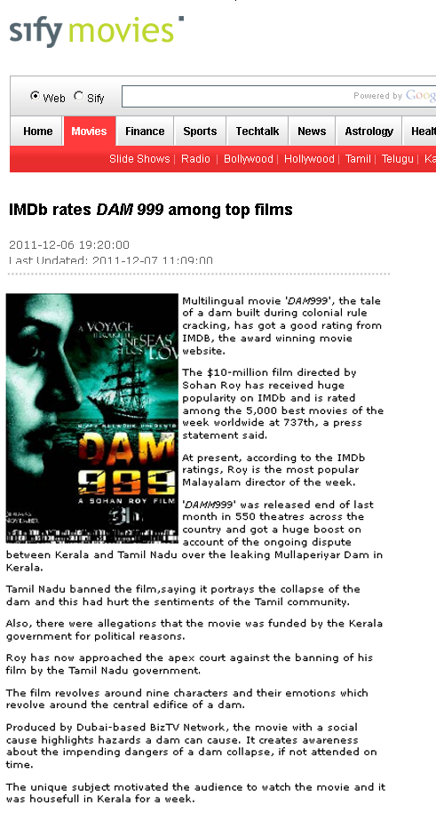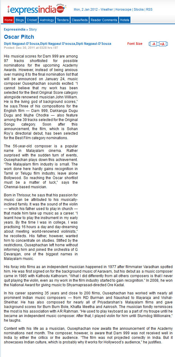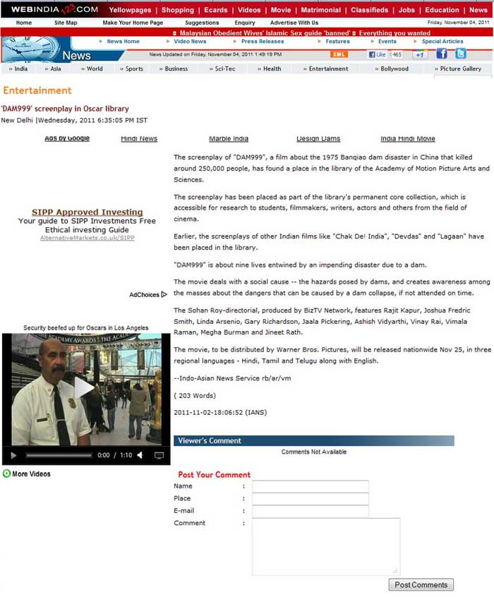 - DAM999' screenplay in Oscar library -Webindia123.com