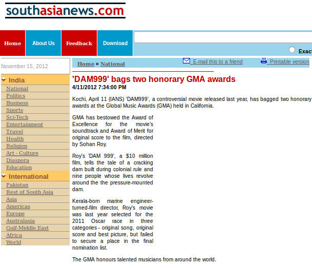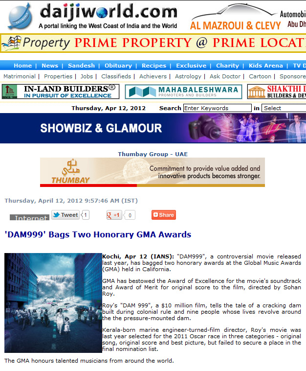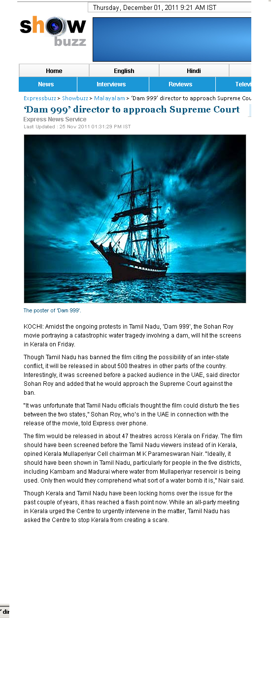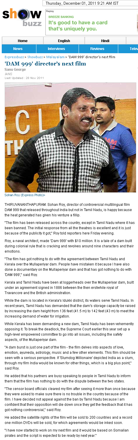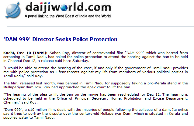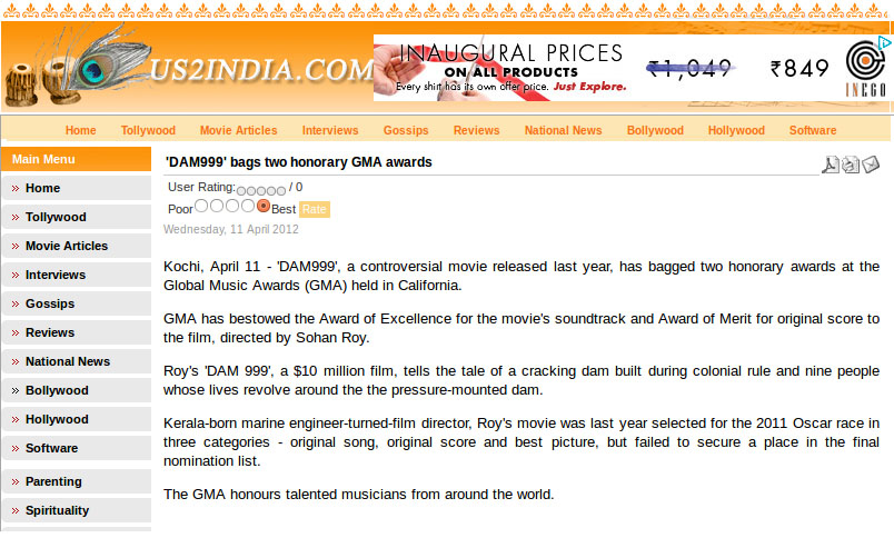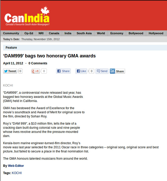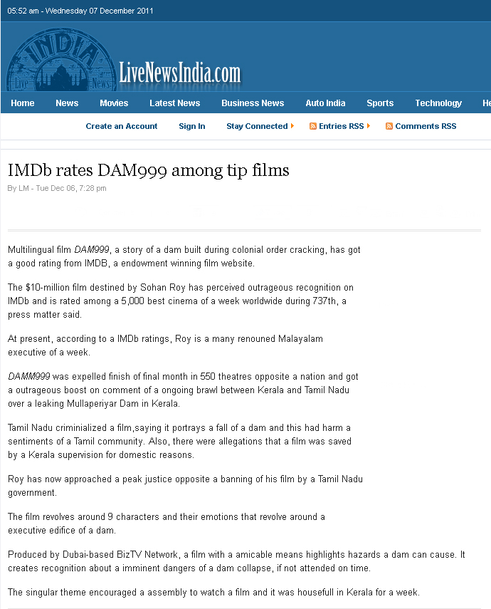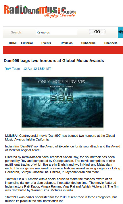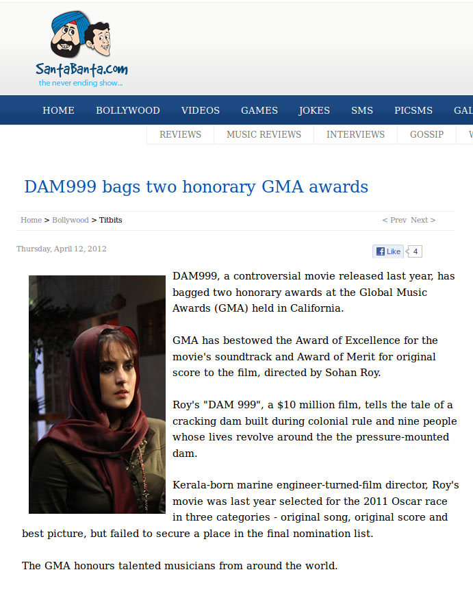 - DAM999' screenplay in Oscar library -Webindia123.com