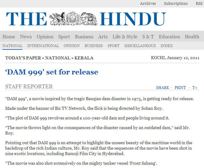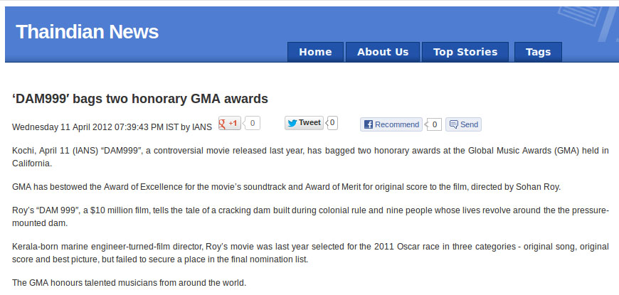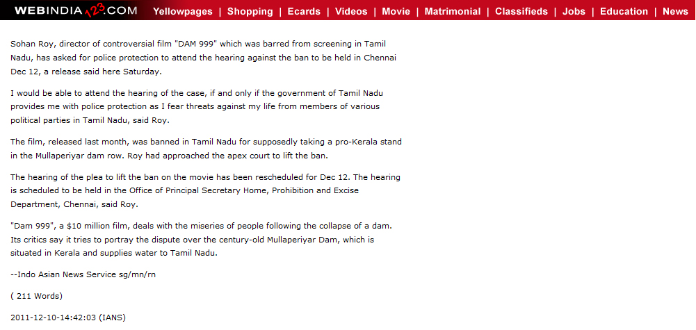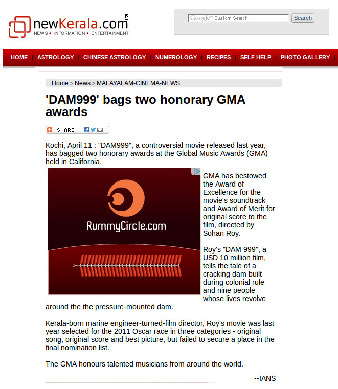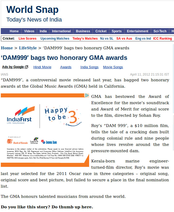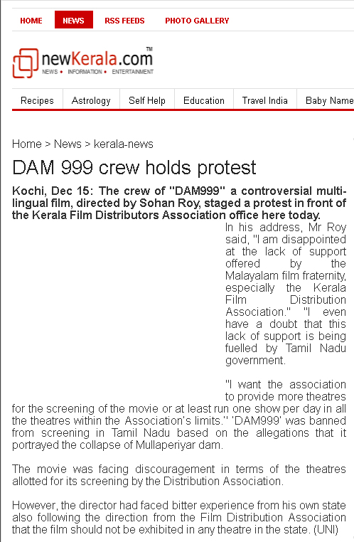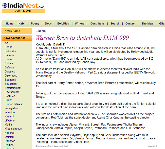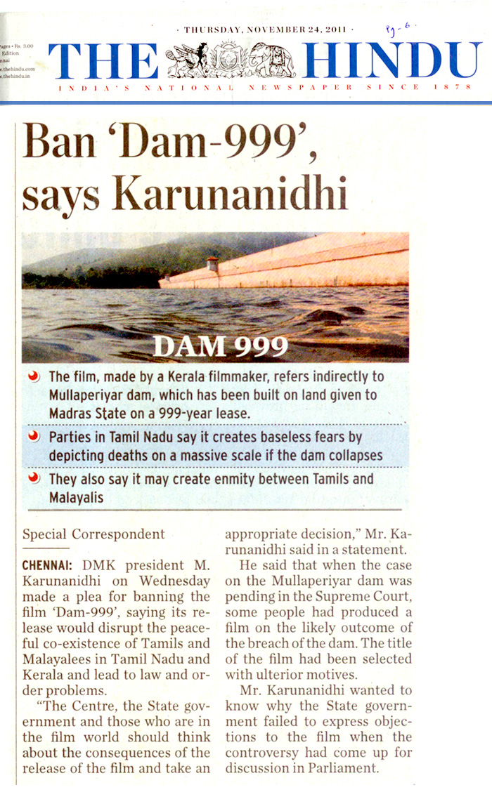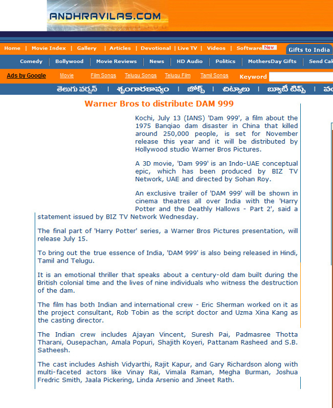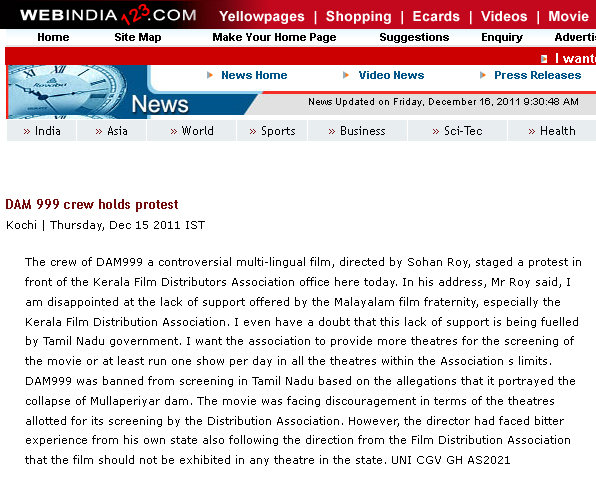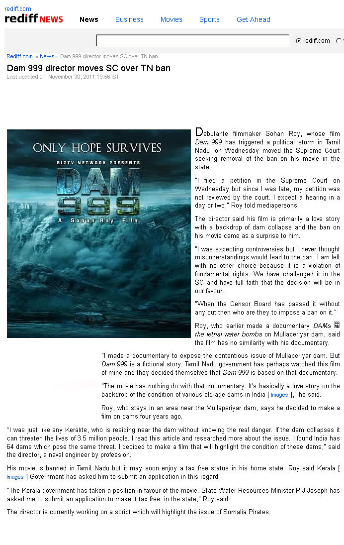 - DAM999' screenplay in Oscar library -Webindia123.com