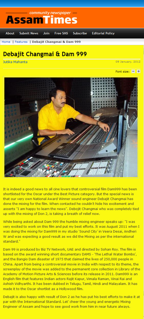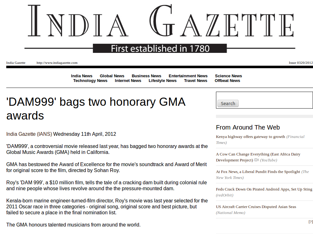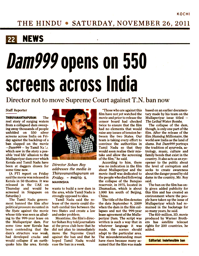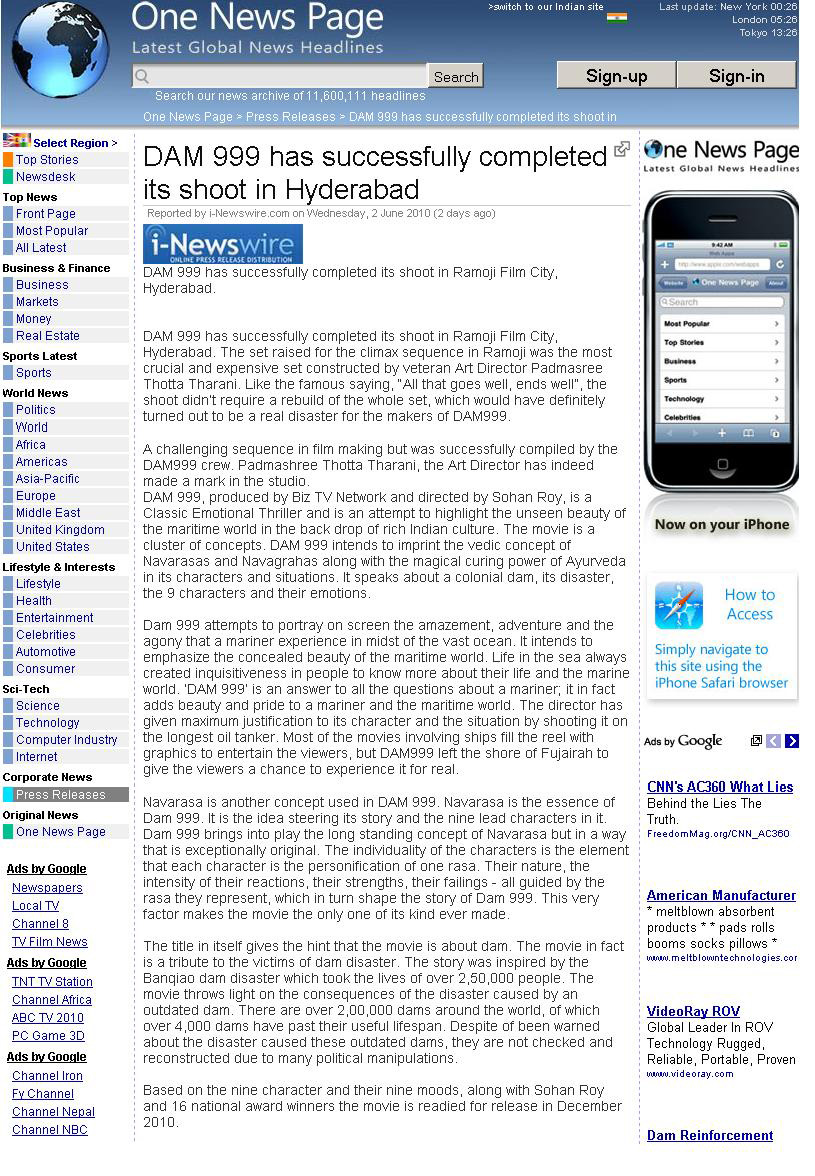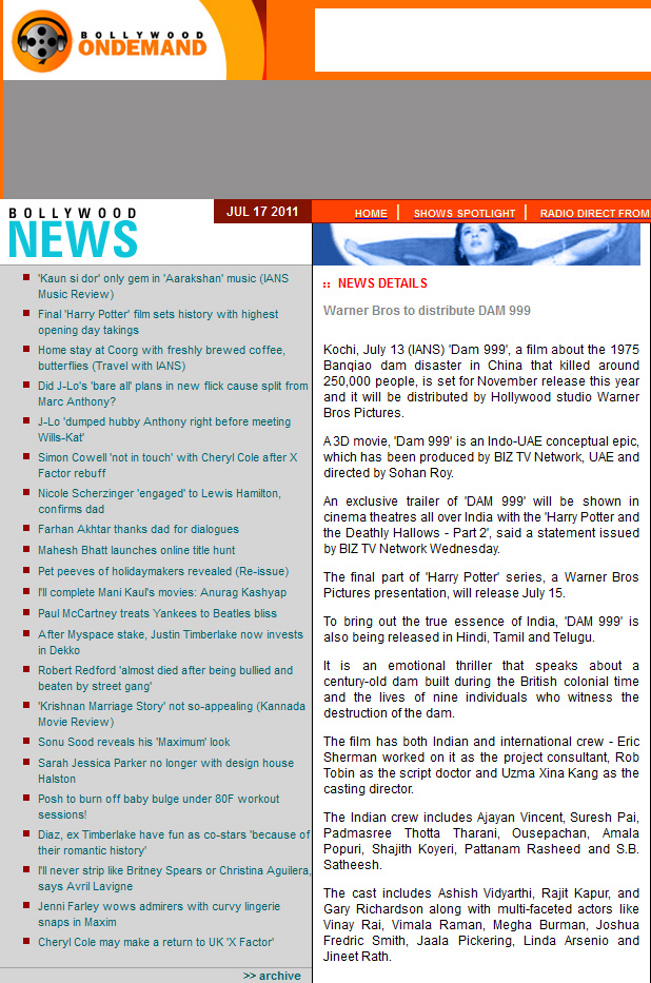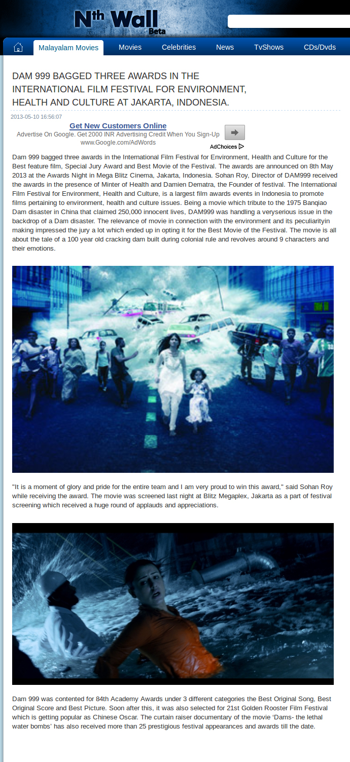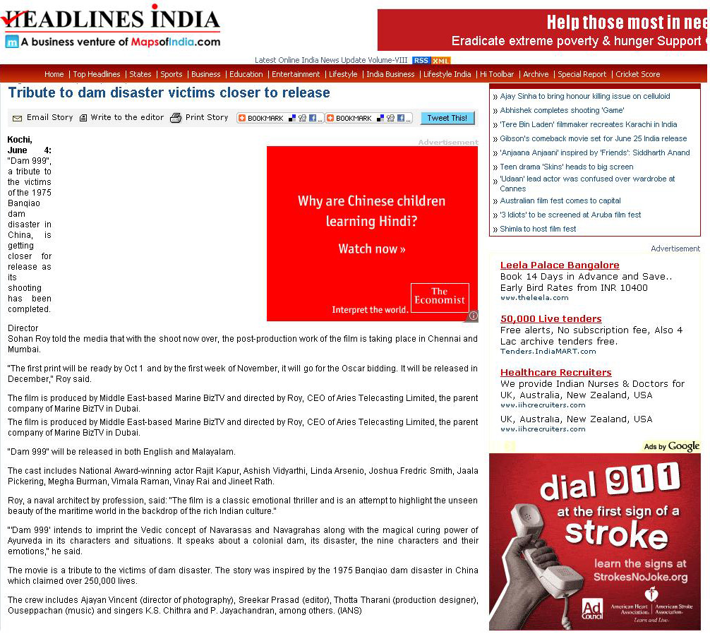 - DAM999' screenplay in Oscar library -Webindia123.com