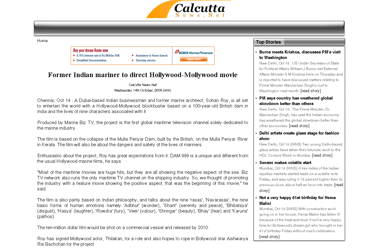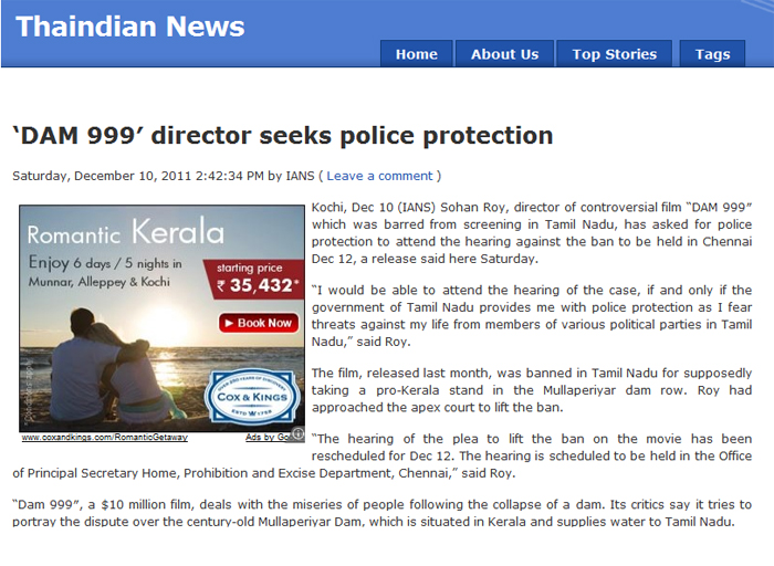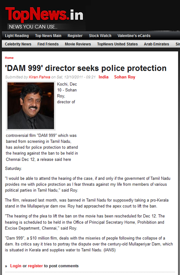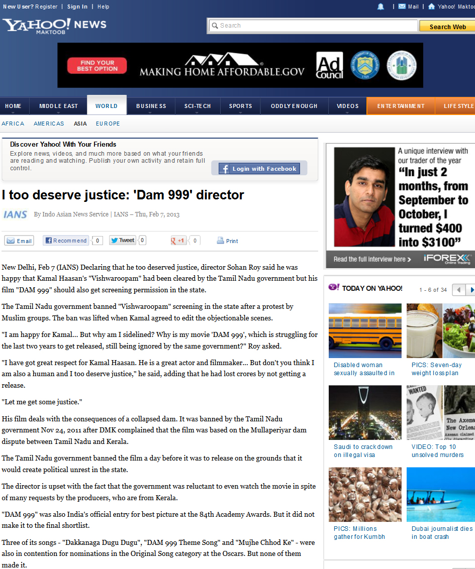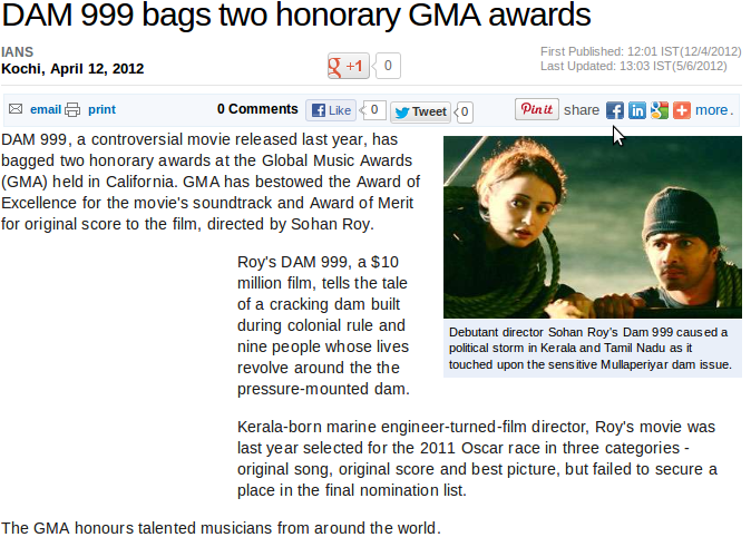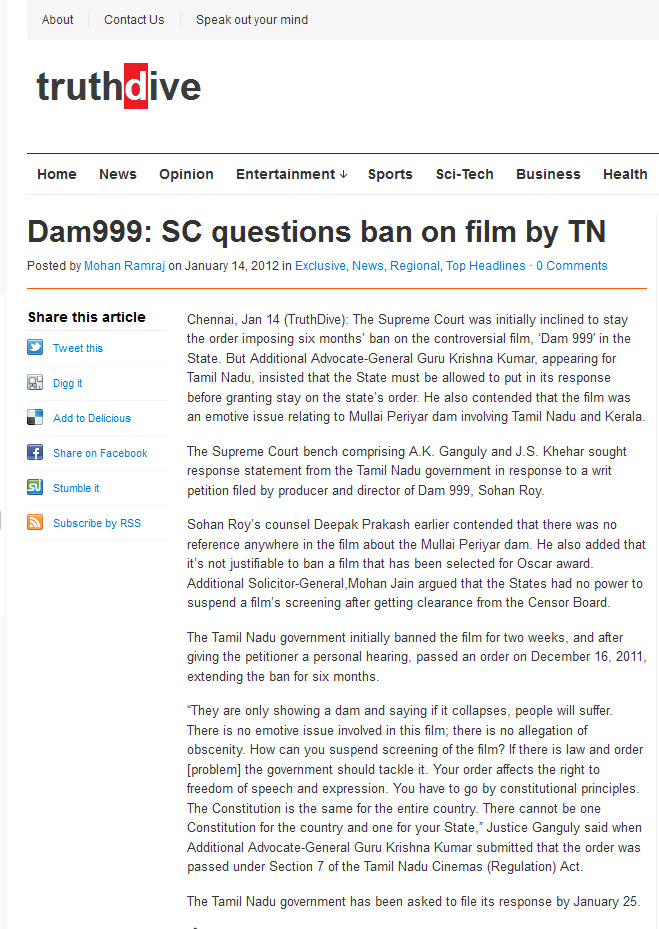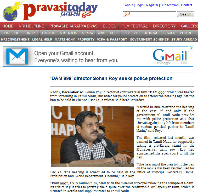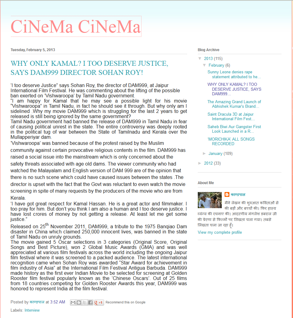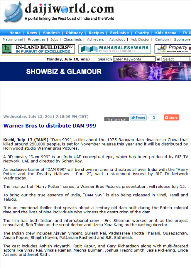 - DAM999' screenplay in Oscar library -Webindia123.com