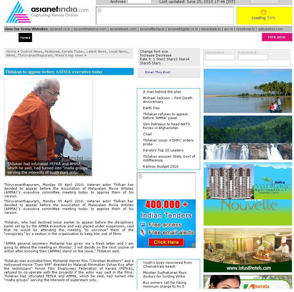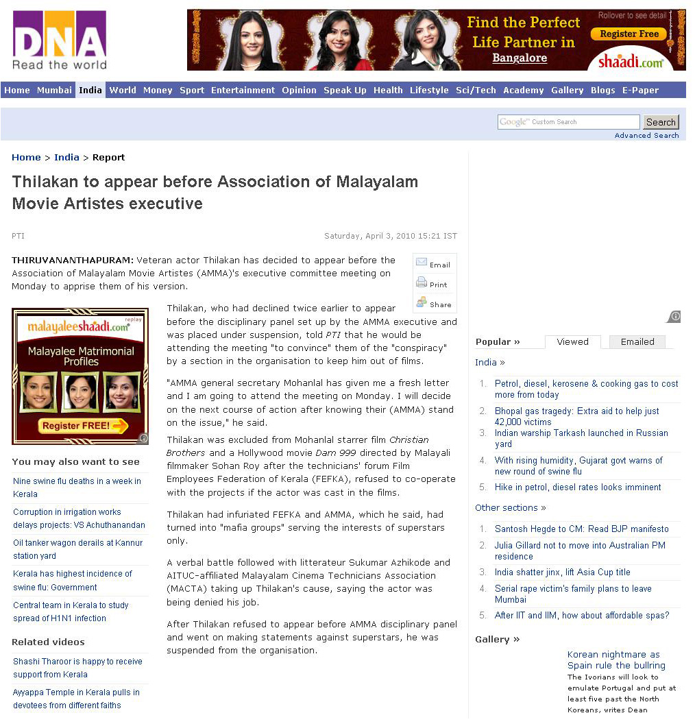 - Thilakan to appear before Association of Malayalam movie artistes executive - DNA