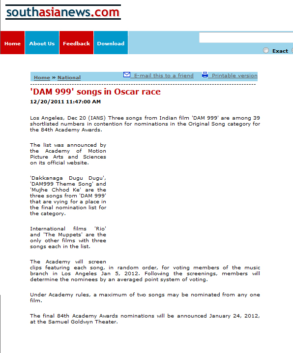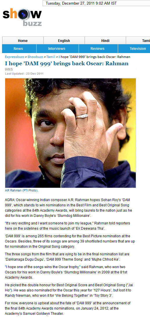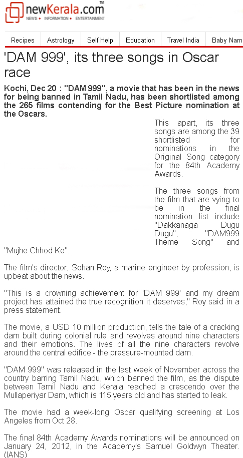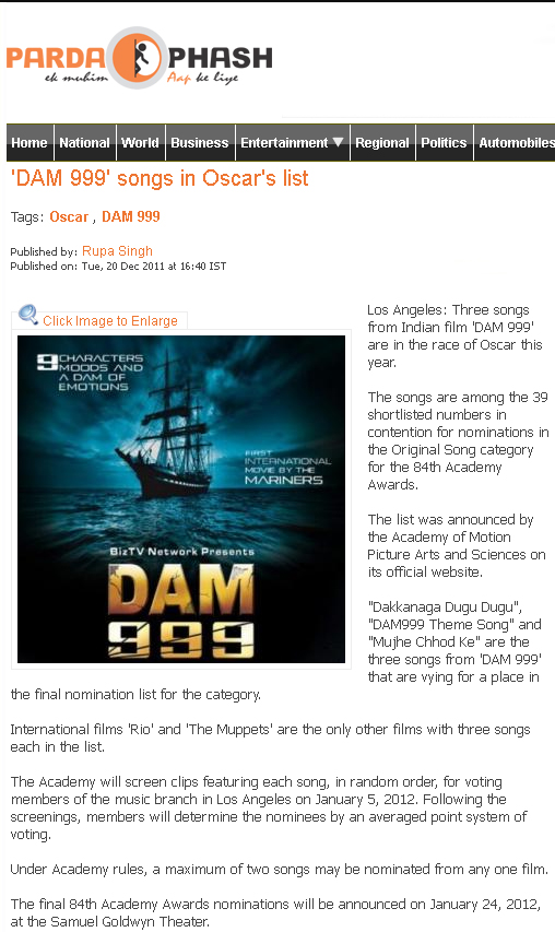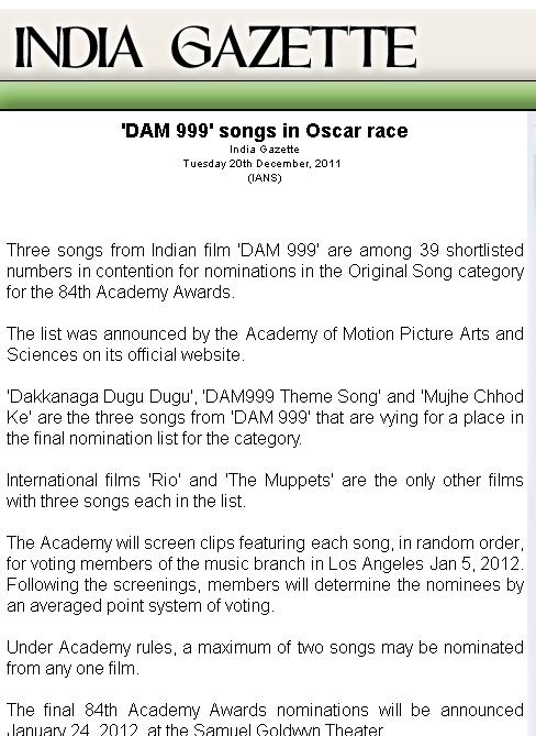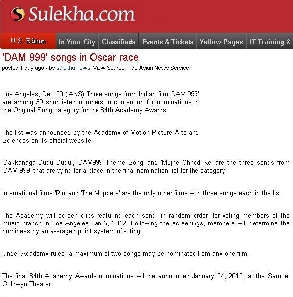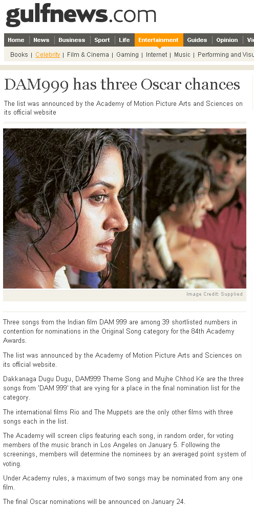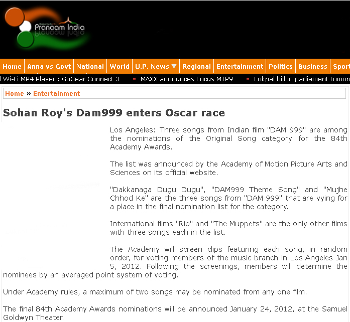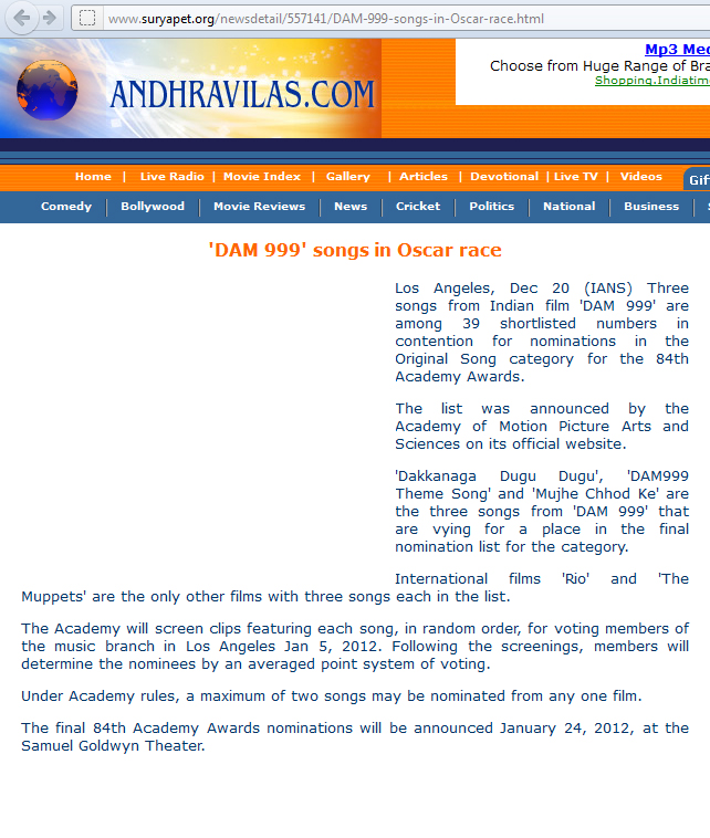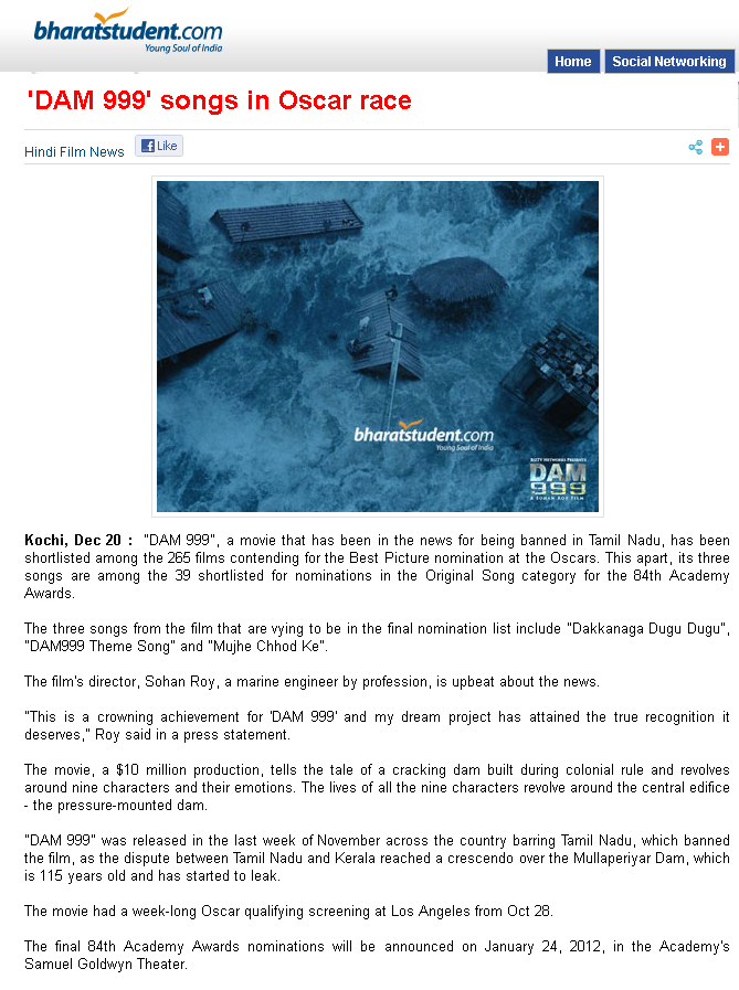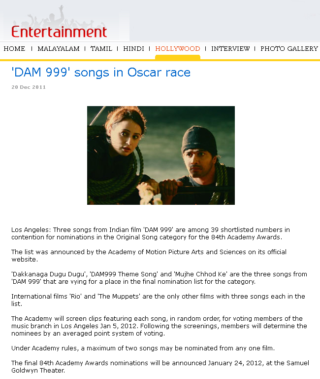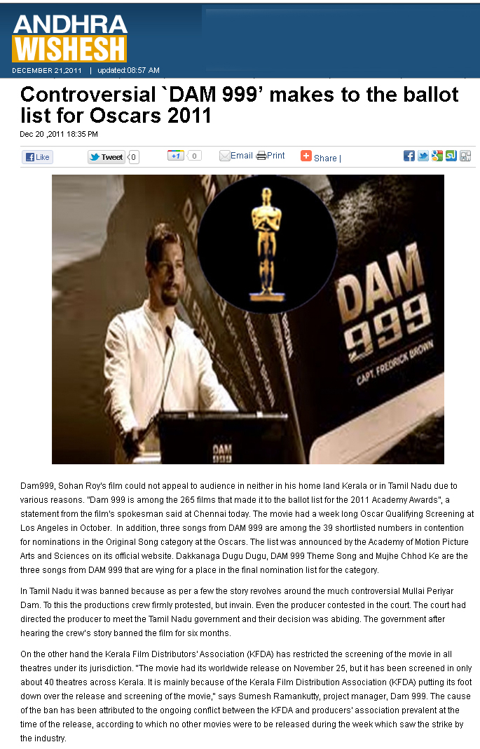 - Controversial 'DAM 999' makes to the ballot list for Oscars 2011 -Andhrawishesh.com