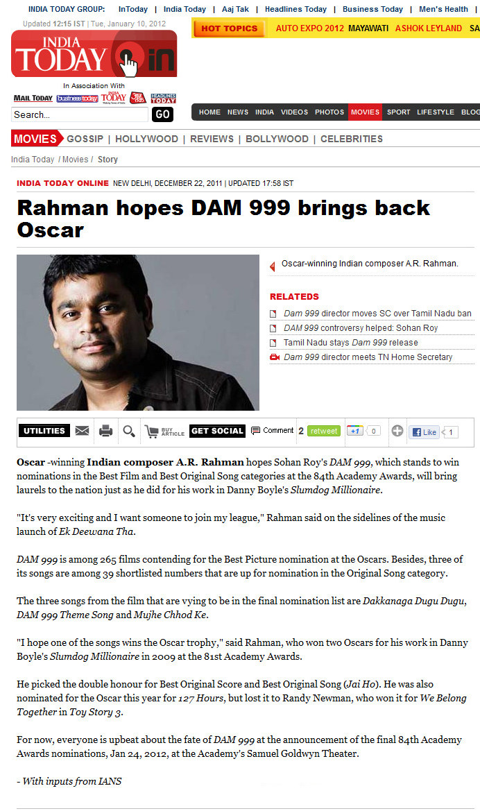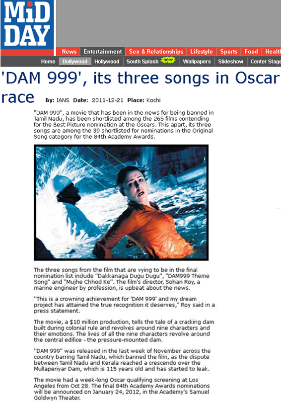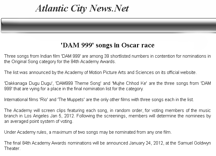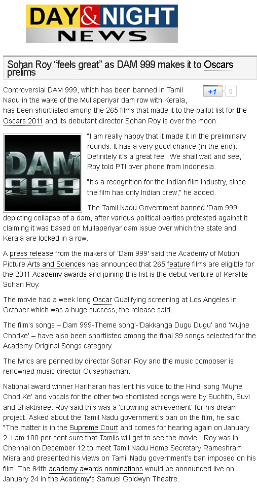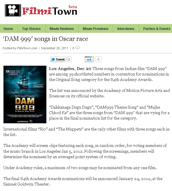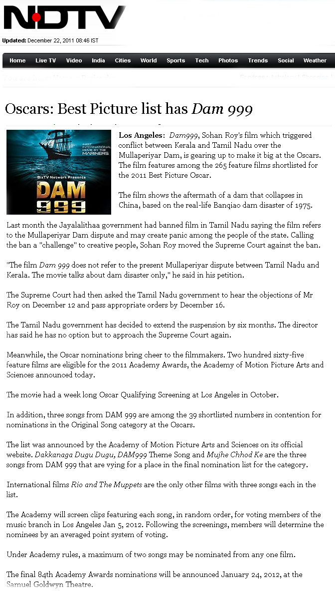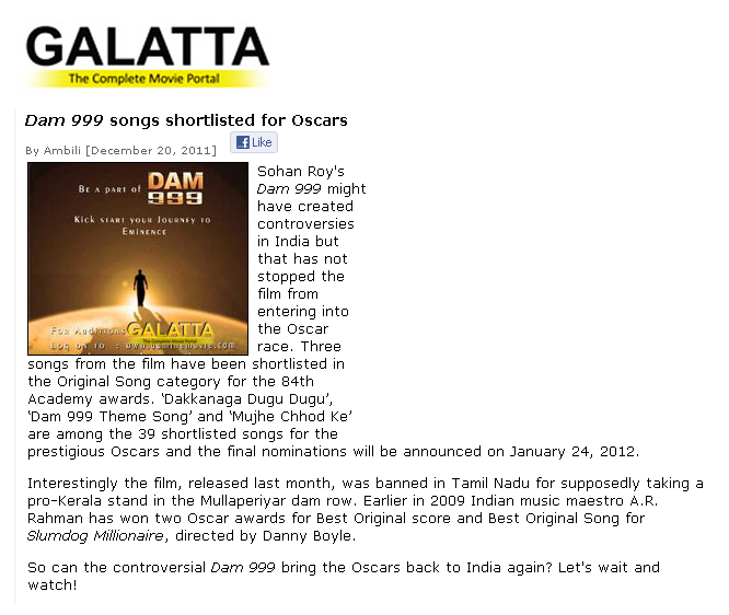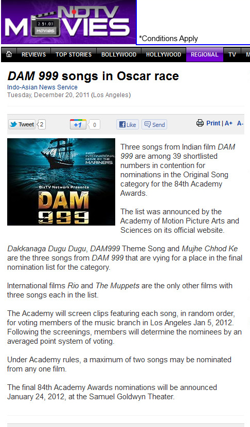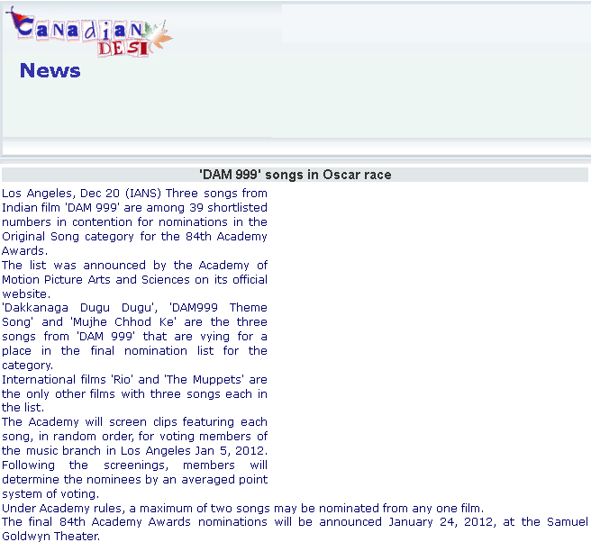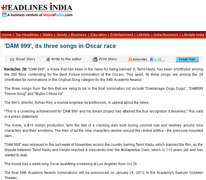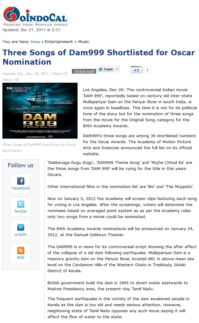 - Controversial 'DAM 999' makes to the ballot list for Oscars 2011 -Andhrawishesh.com