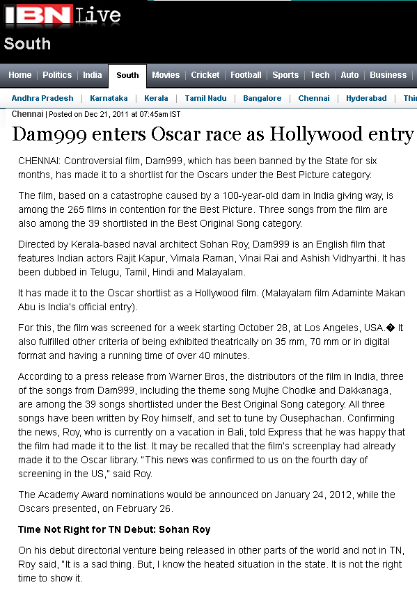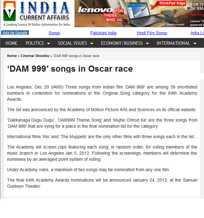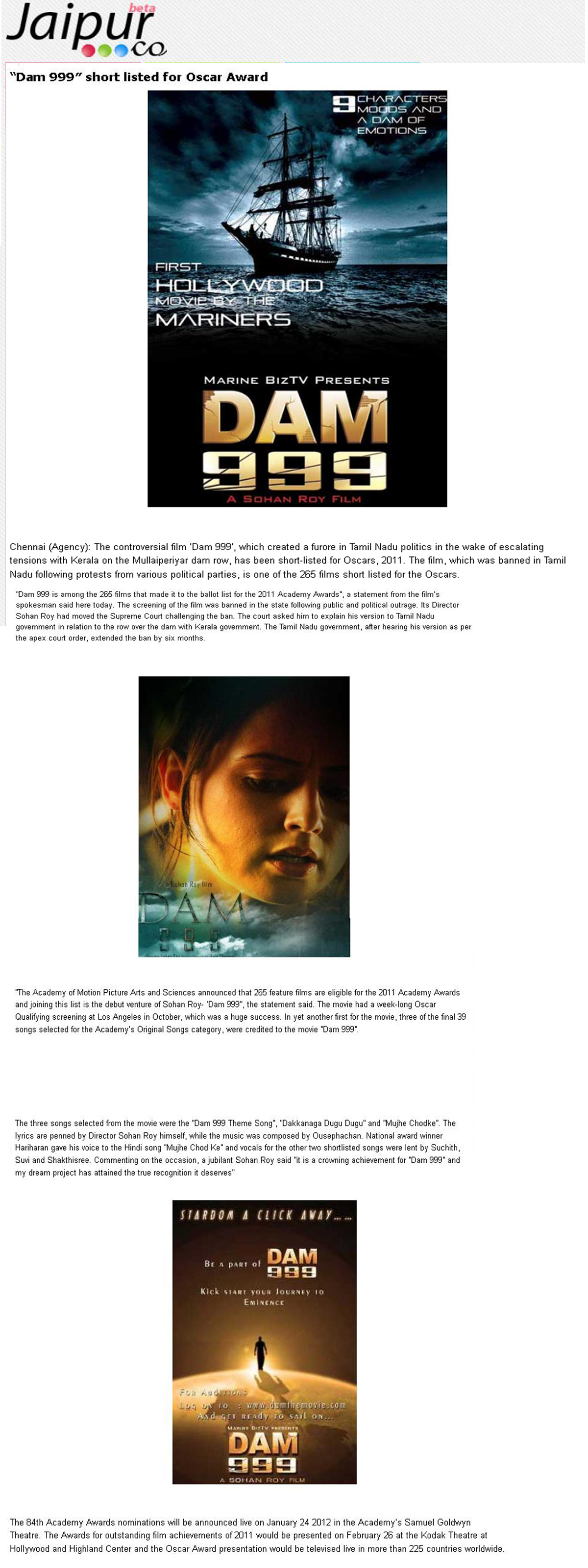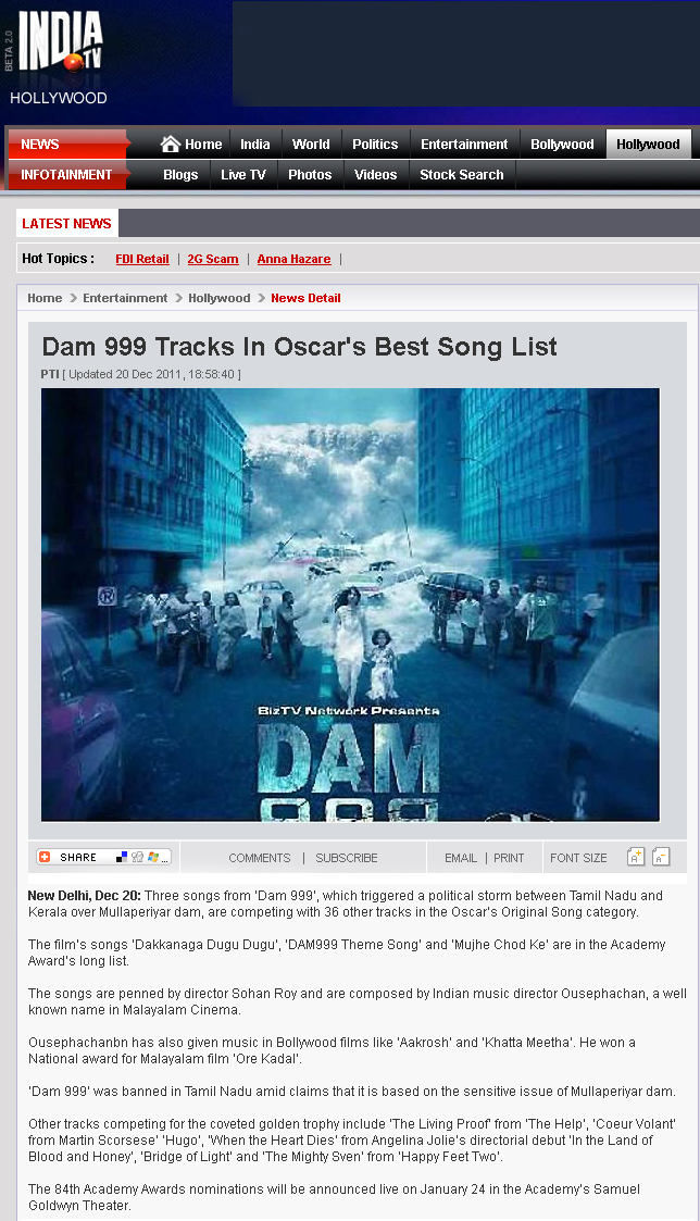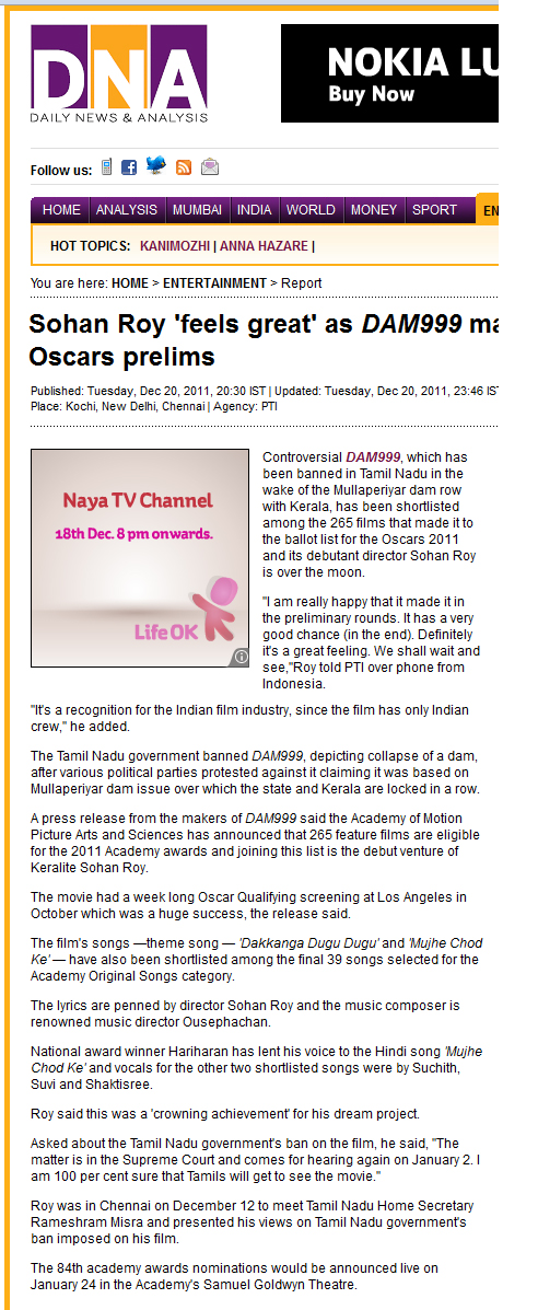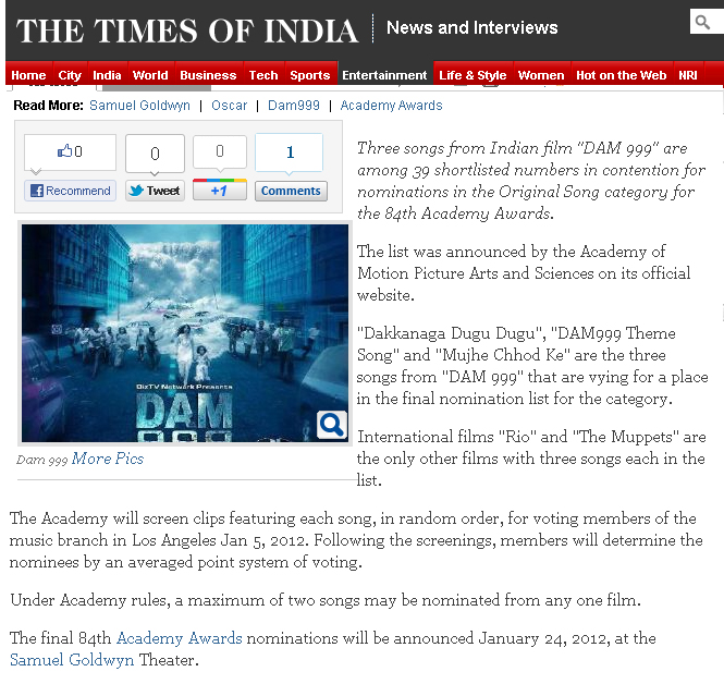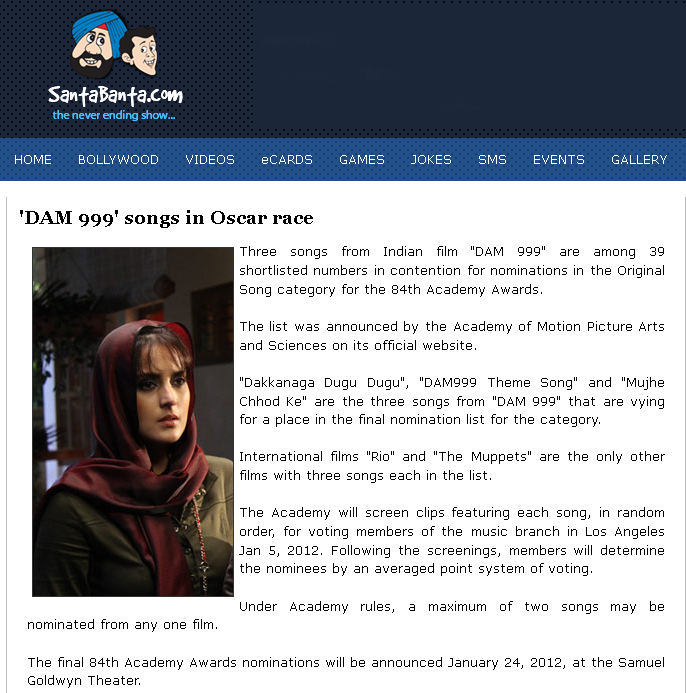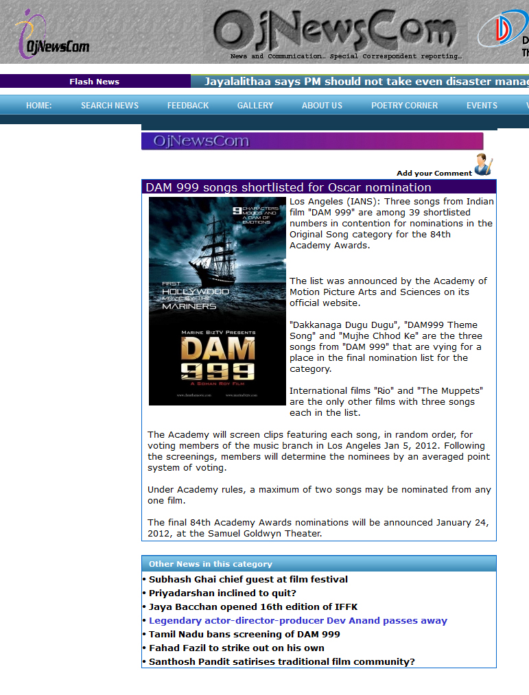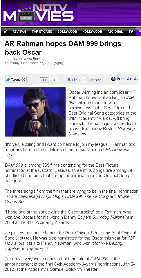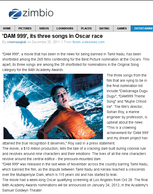 - Controversial 'DAM 999' makes to the ballot list for Oscars 2011 -Andhrawishesh.com