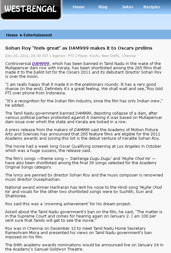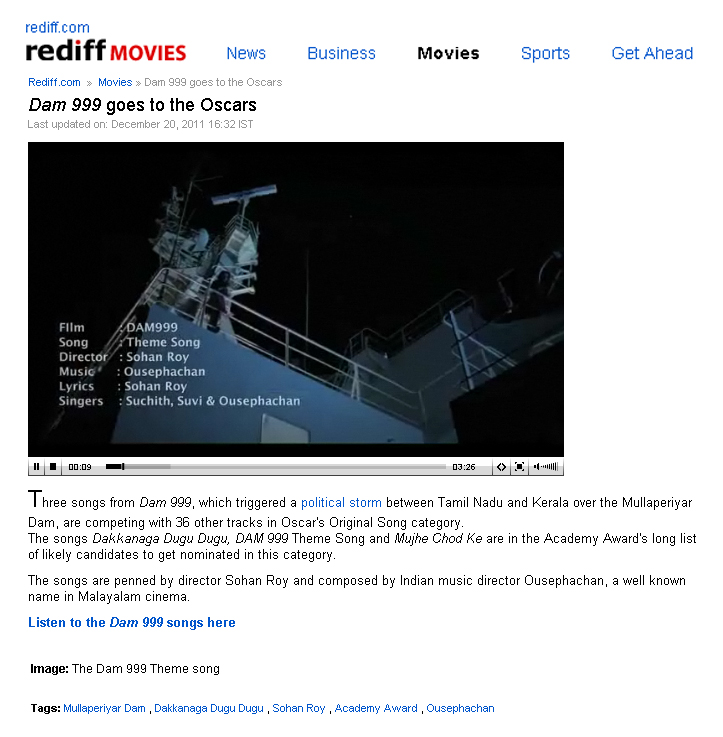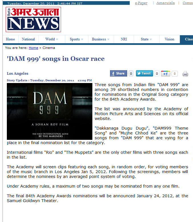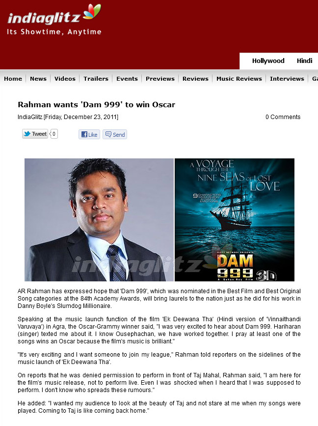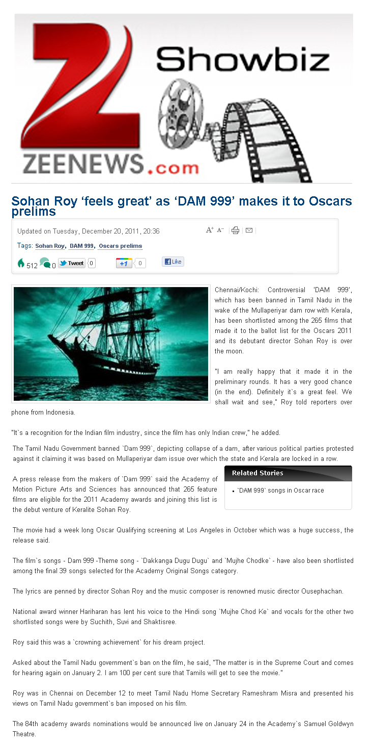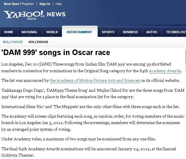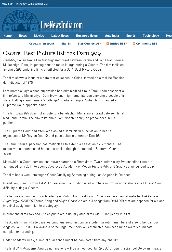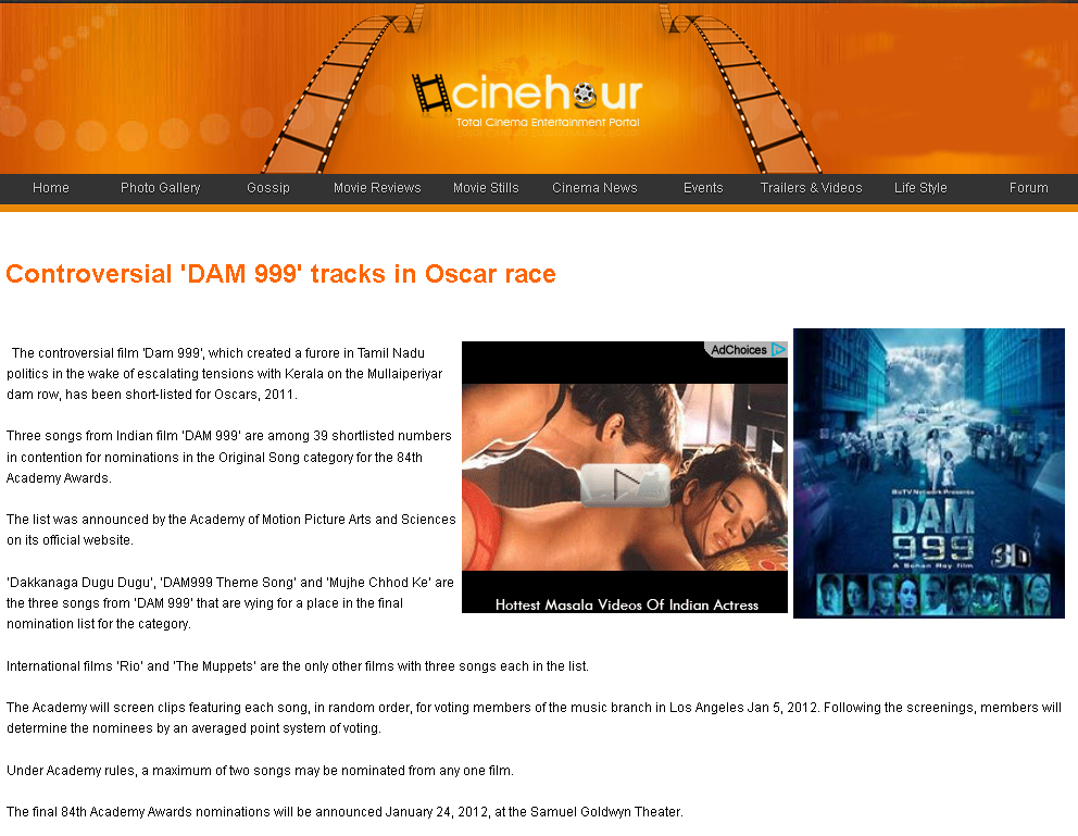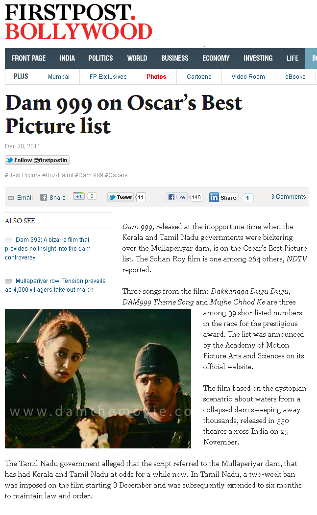 - Controversial 'DAM 999' makes to the ballot list for Oscars 2011 -Andhrawishesh.com