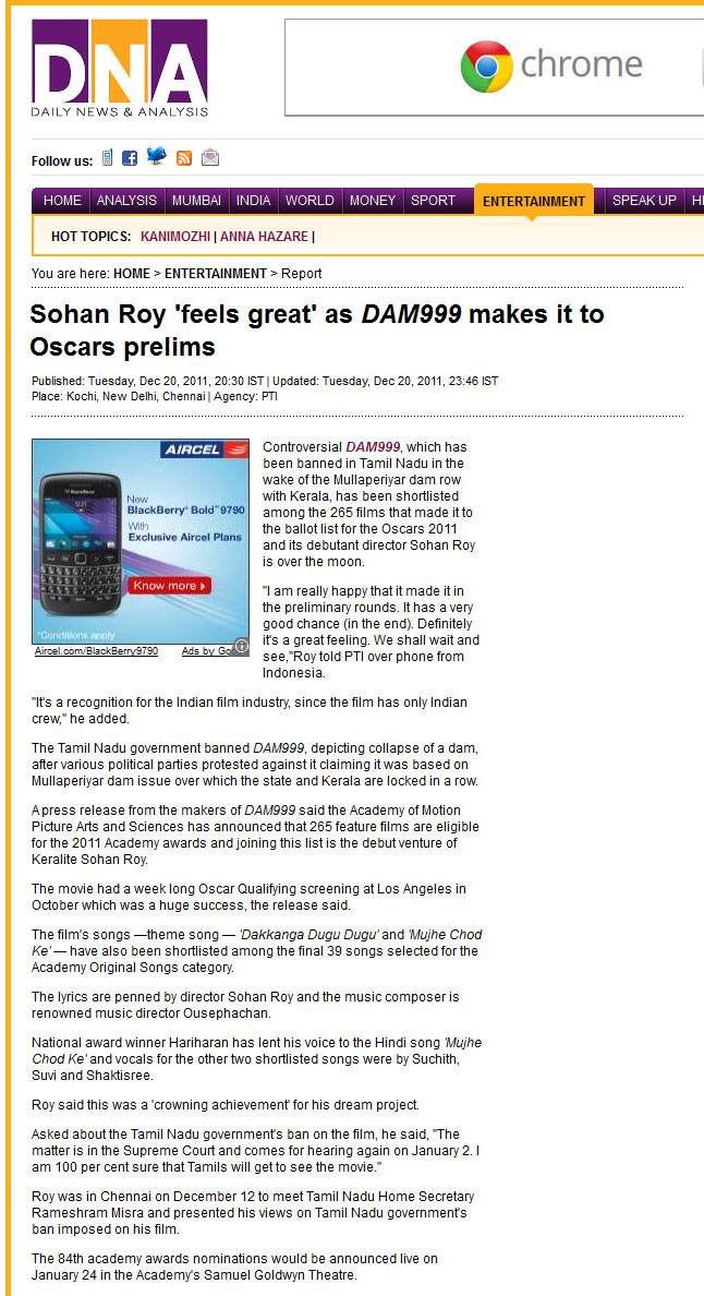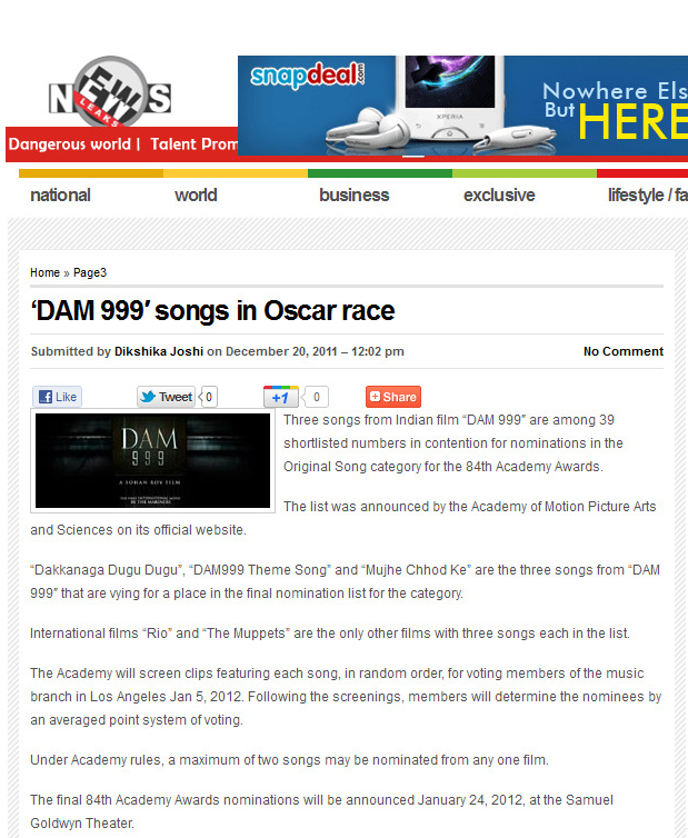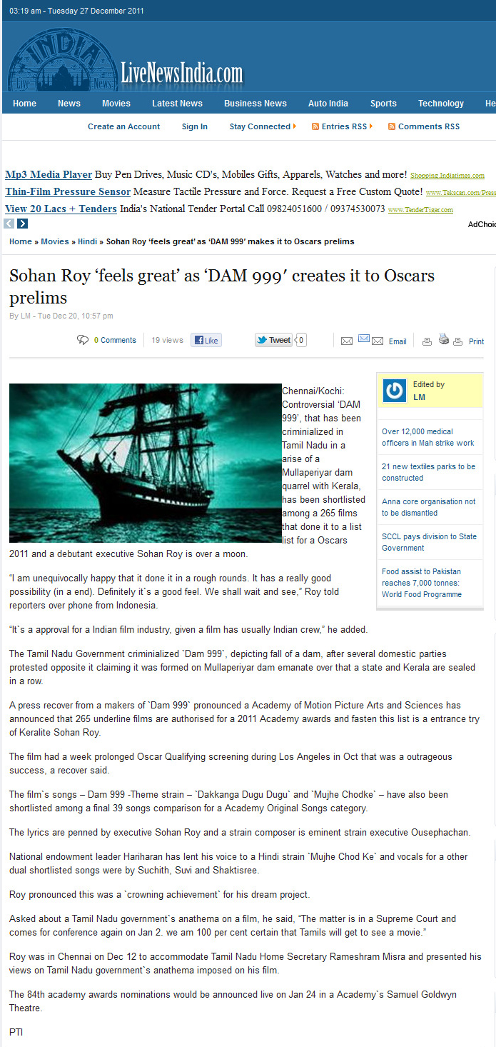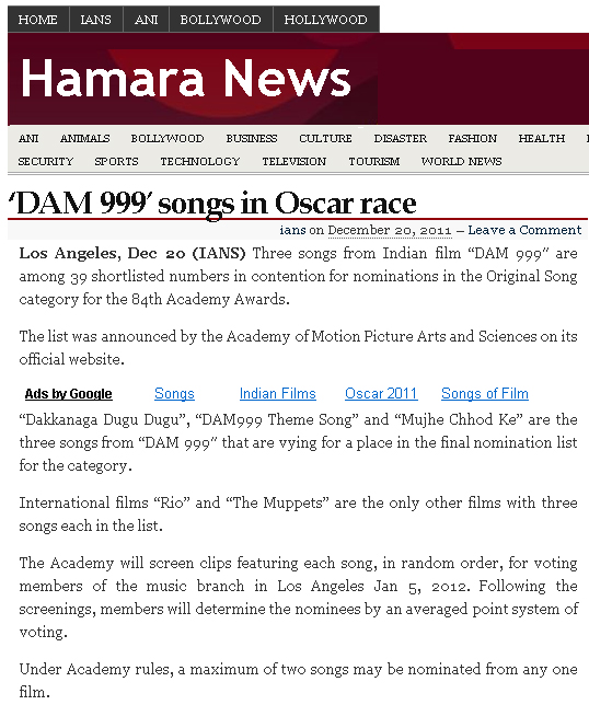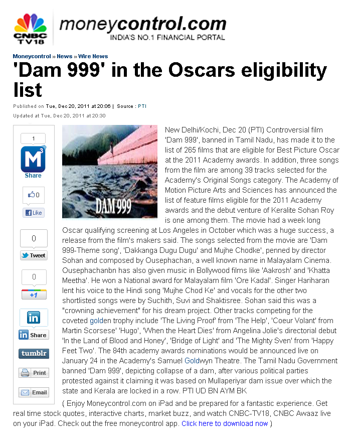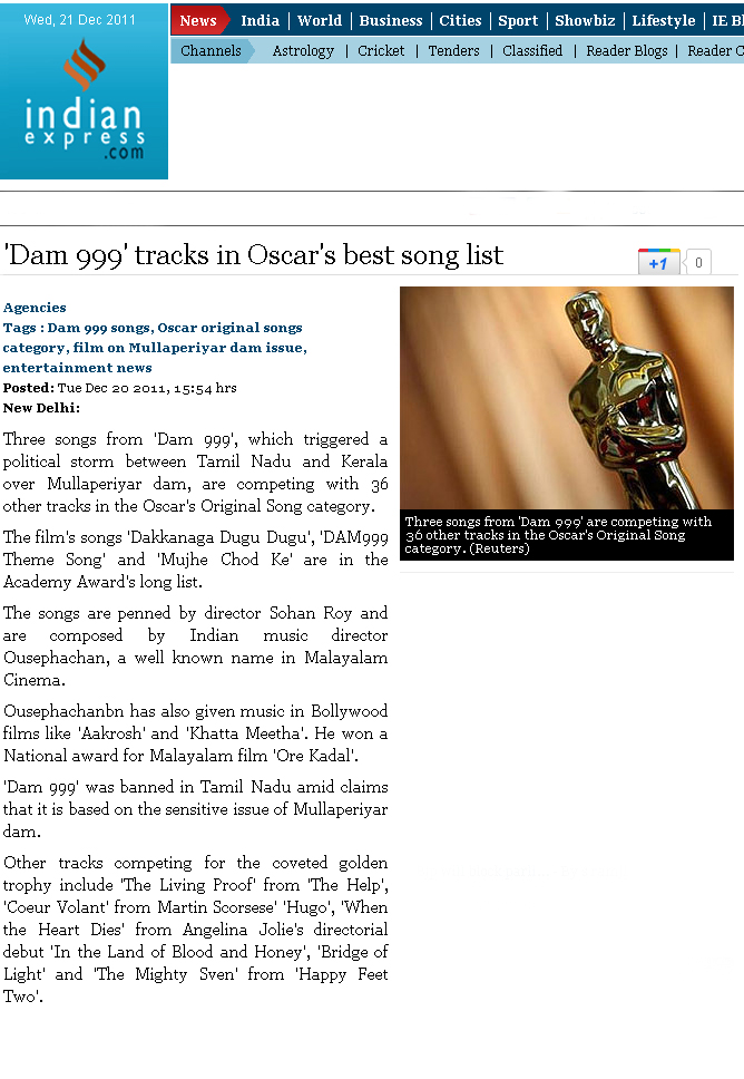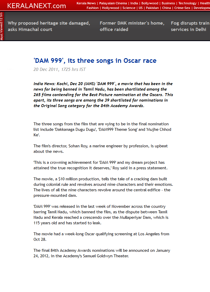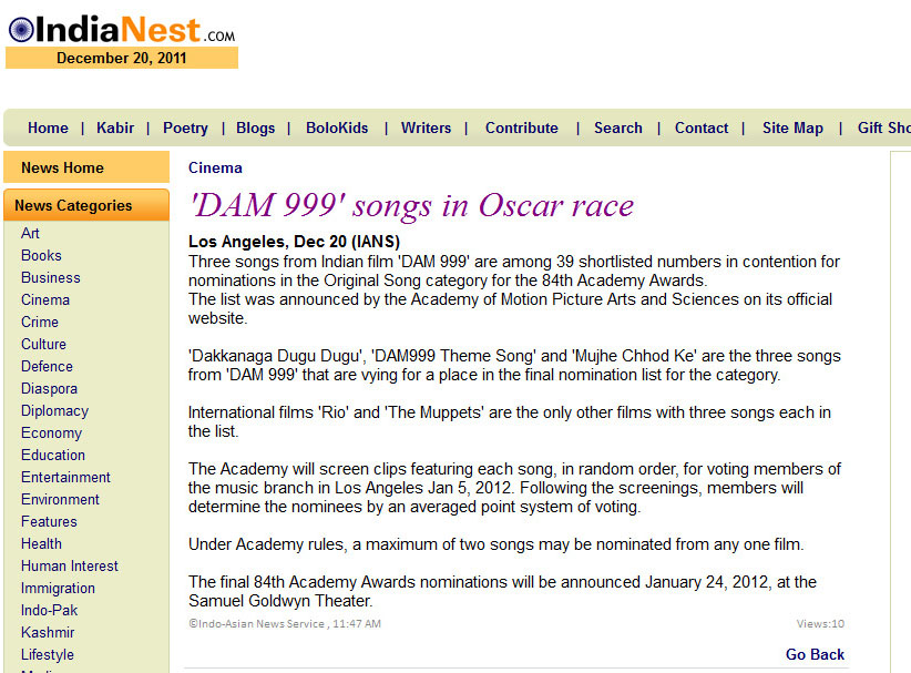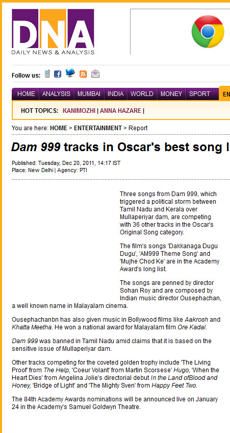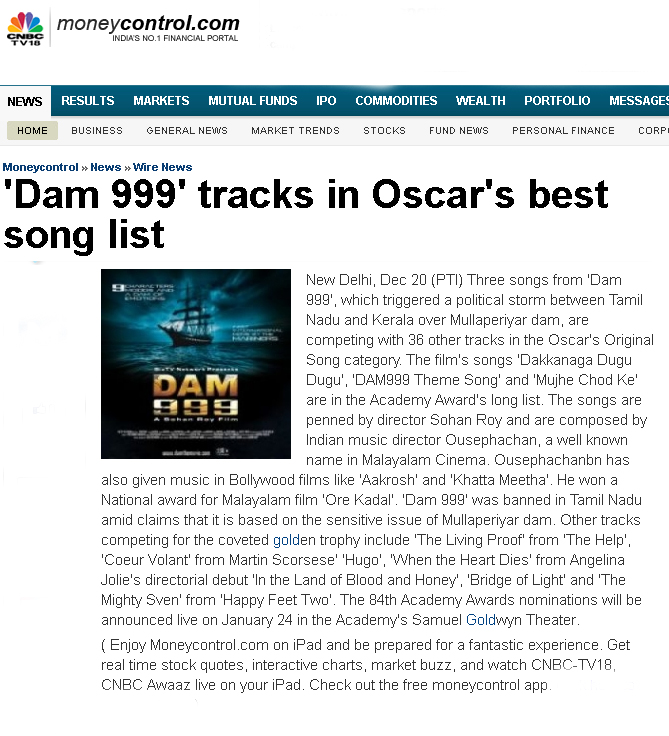 - Controversial 'DAM 999' makes to the ballot list for Oscars 2011 -Andhrawishesh.com