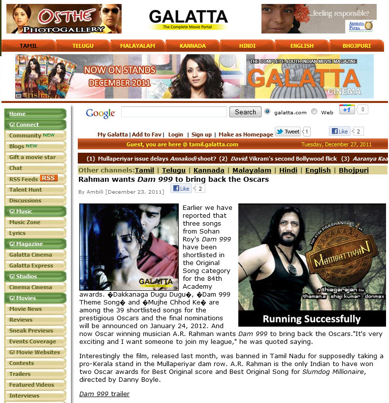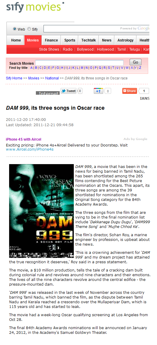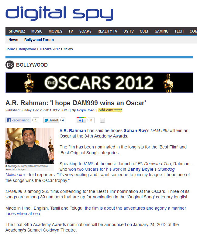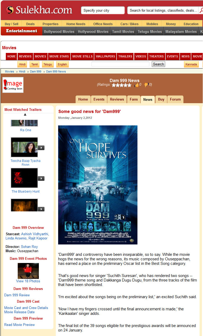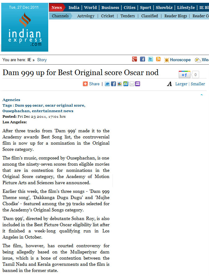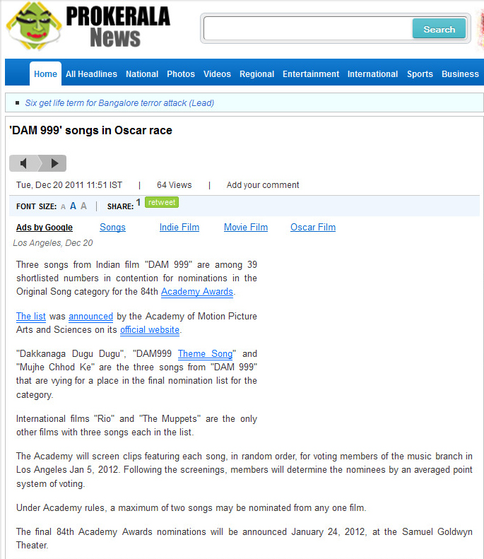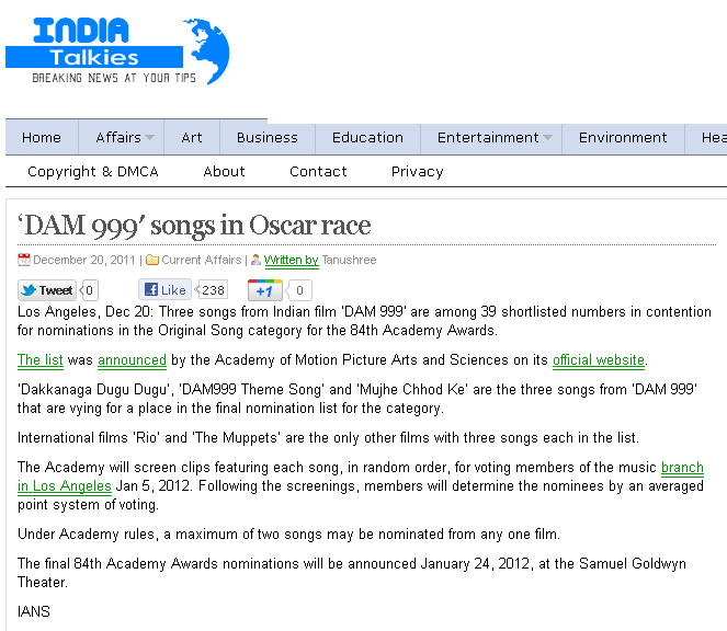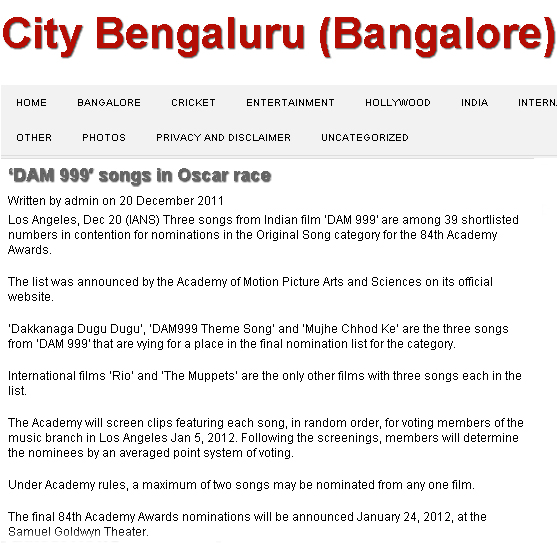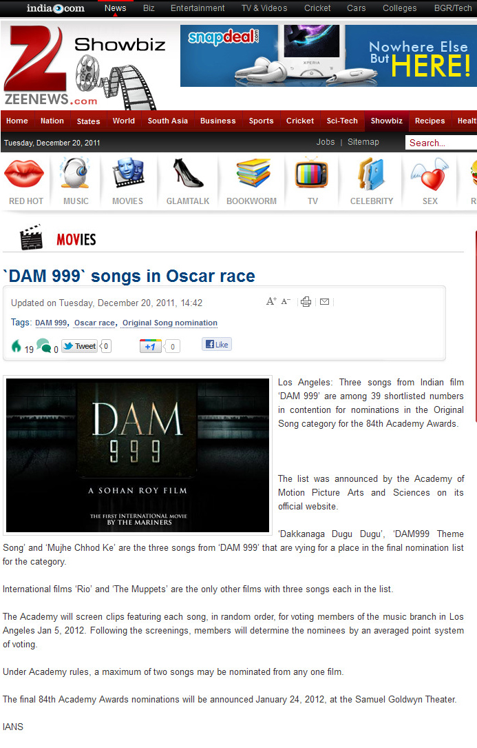- Controversial 'DAM 999' makes to the ballot list for Oscars 2011 -Andhrawishesh.com