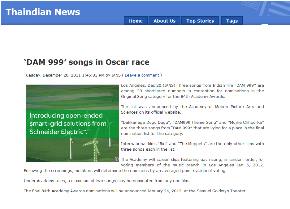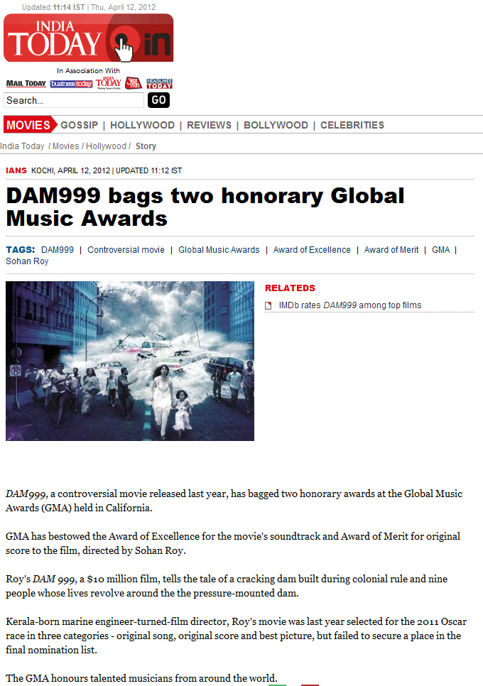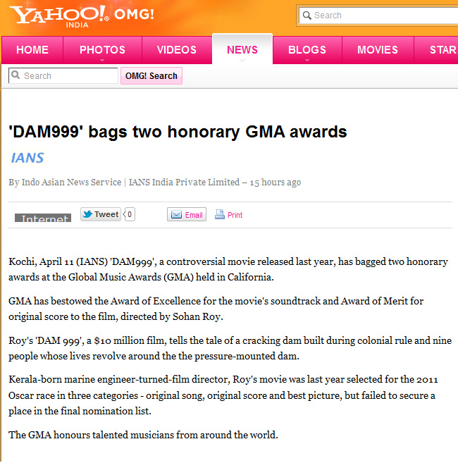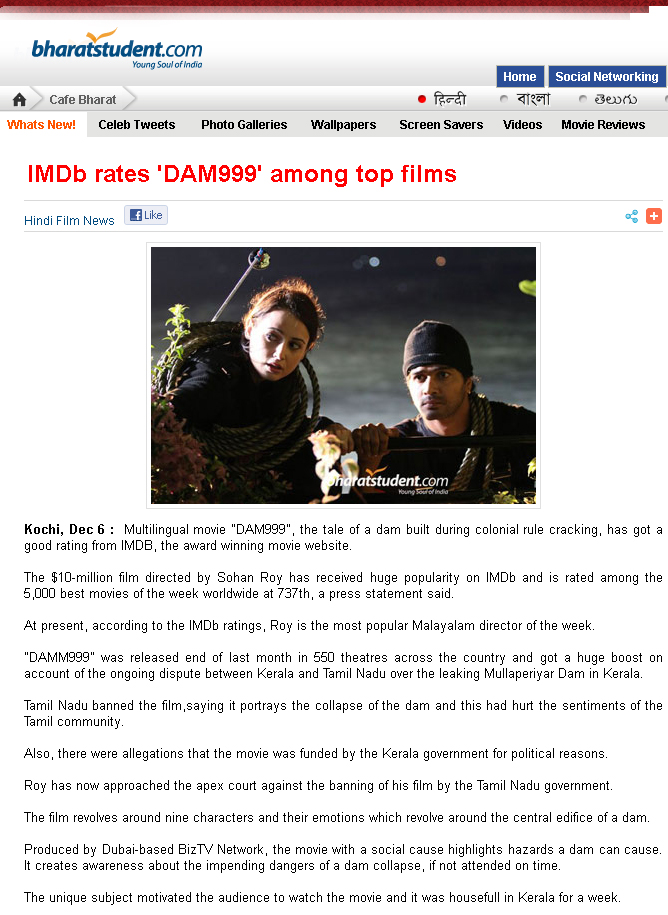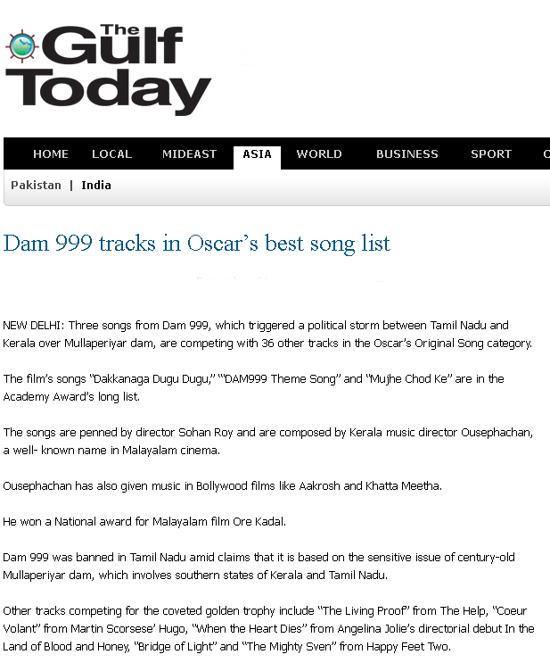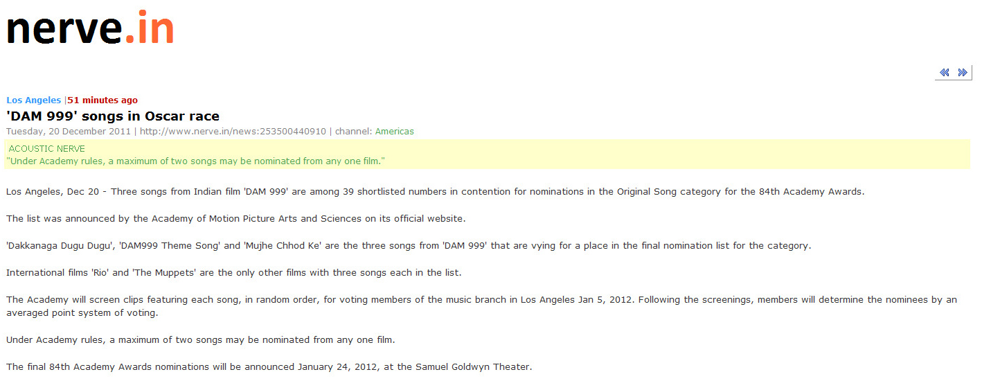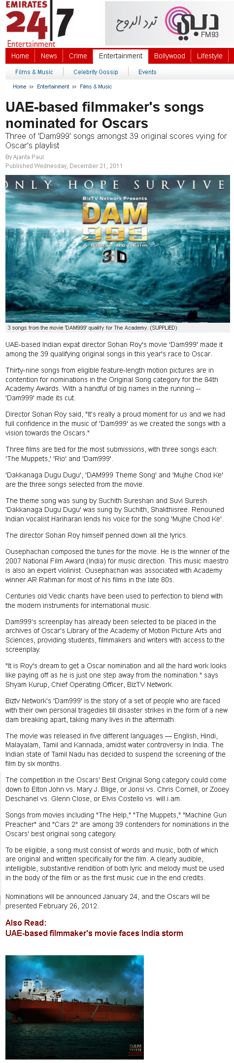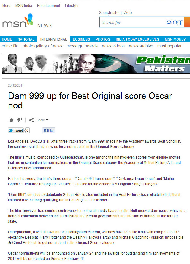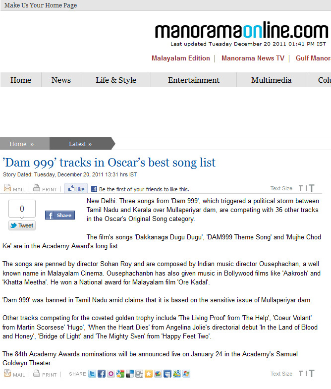 - Controversial 'DAM 999' makes to the ballot list for Oscars 2011 -Andhrawishesh.com