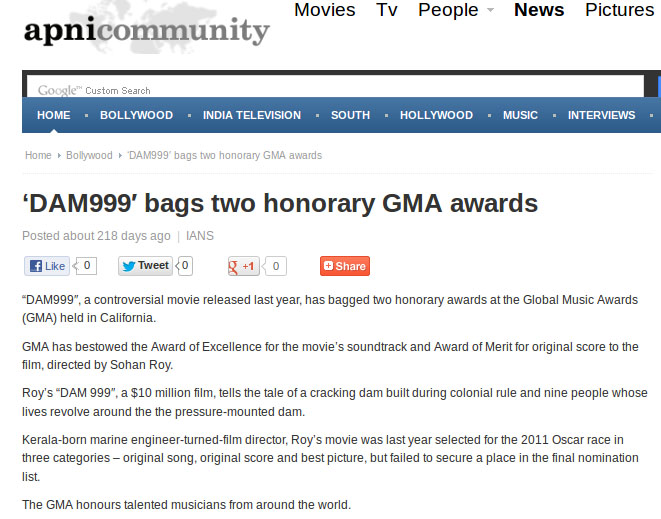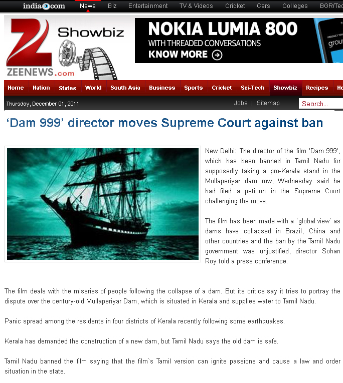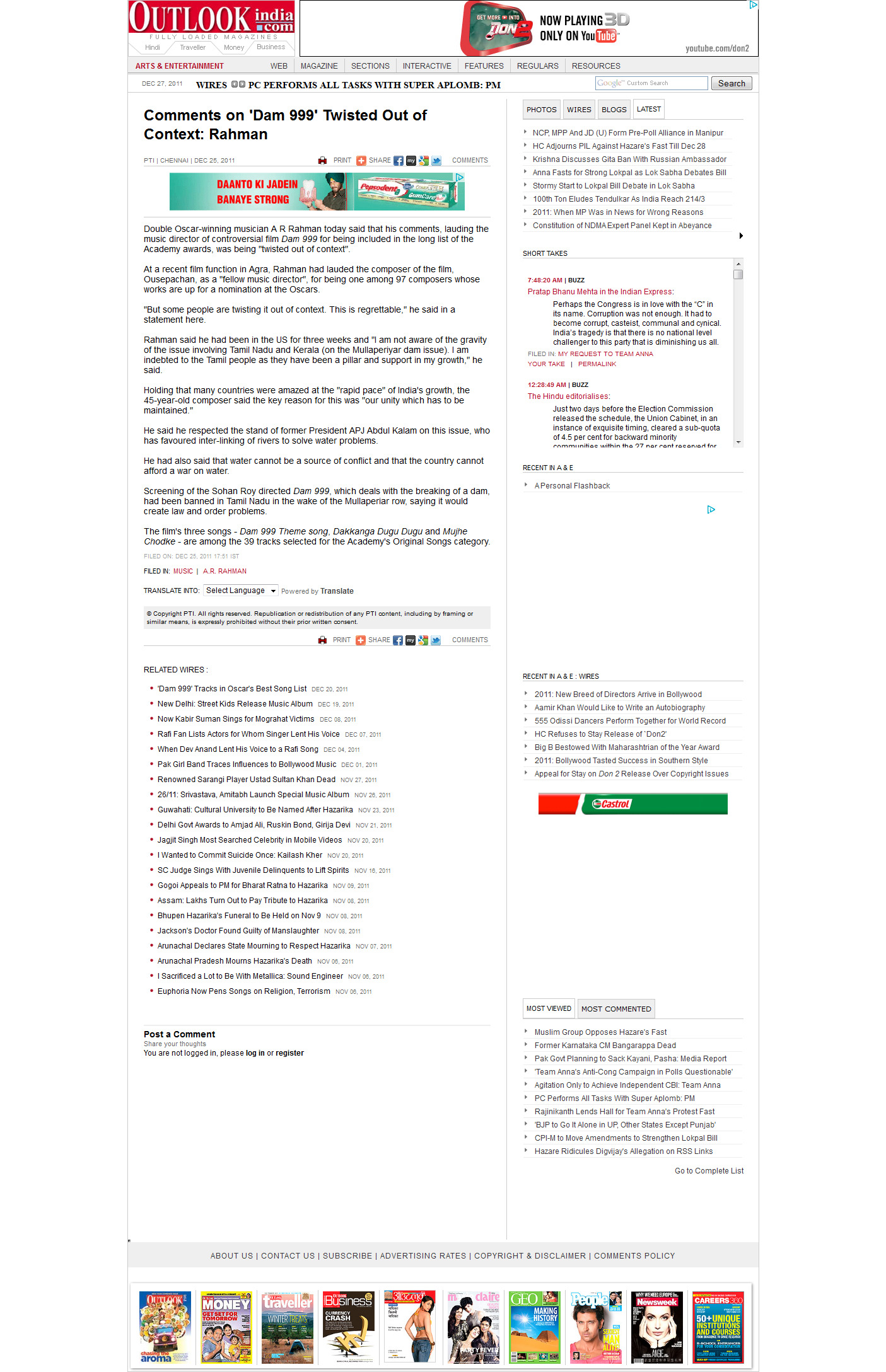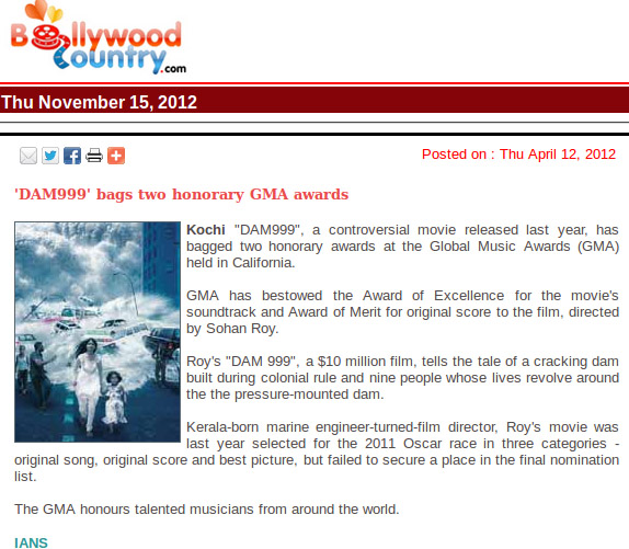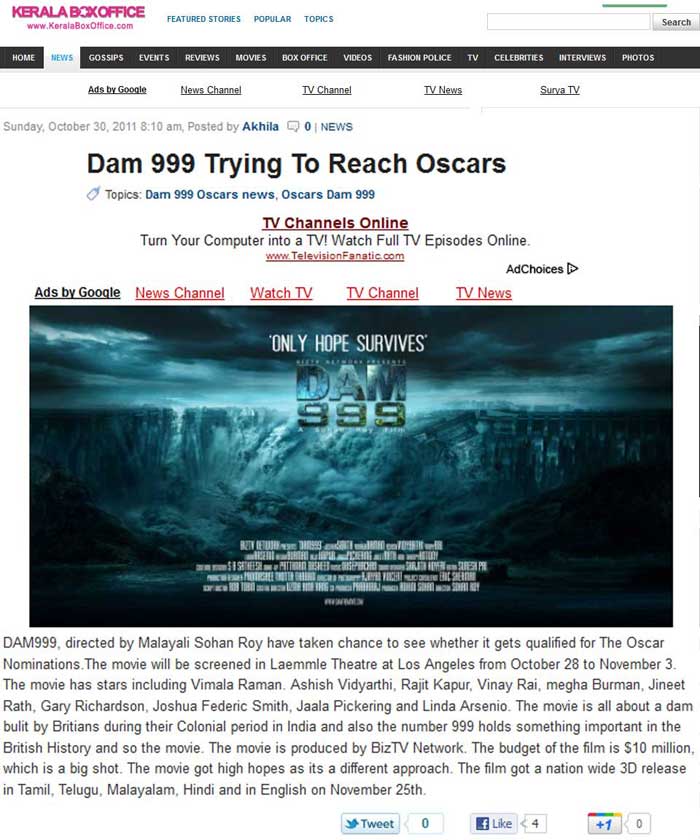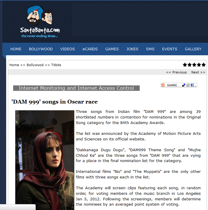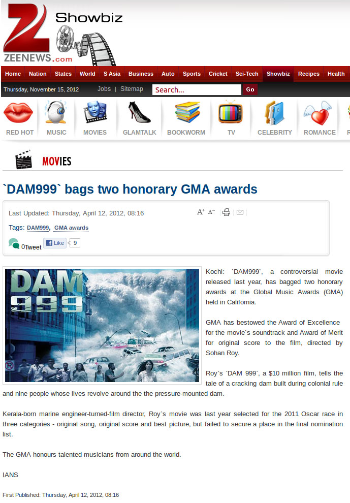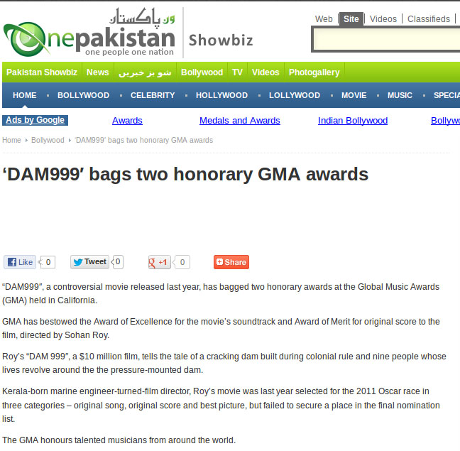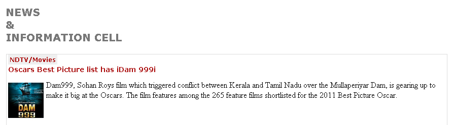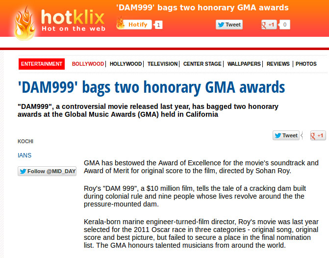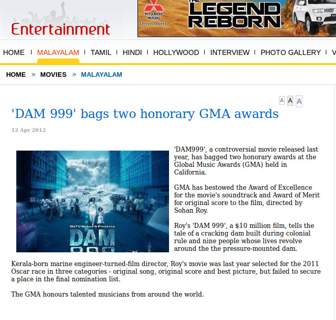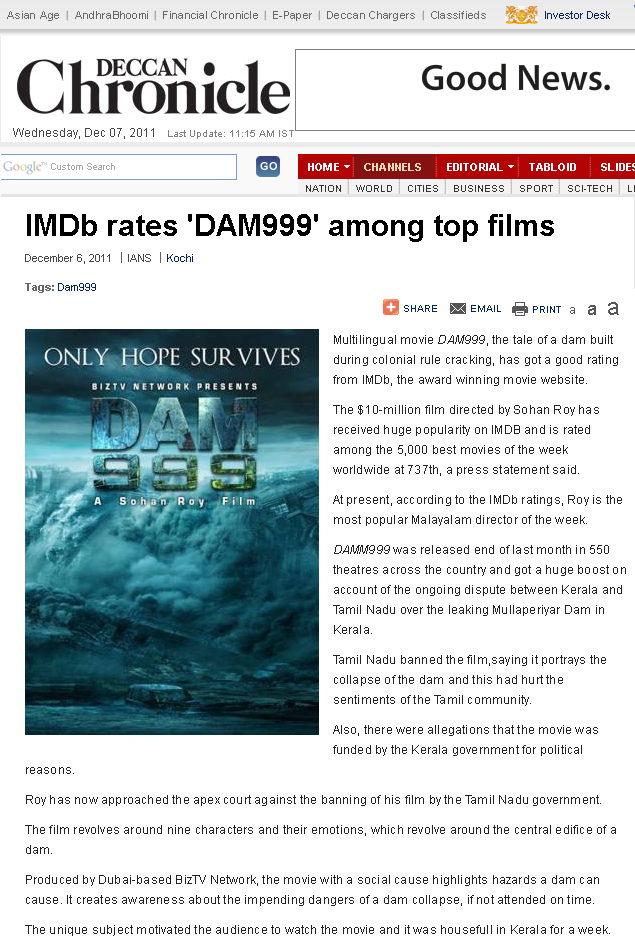 - Controversial 'DAM 999' makes to the ballot list for Oscars 2011 -Andhrawishesh.com