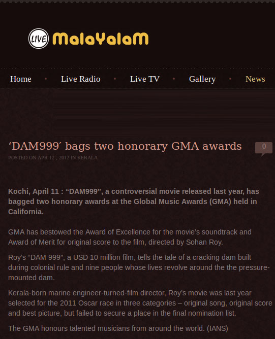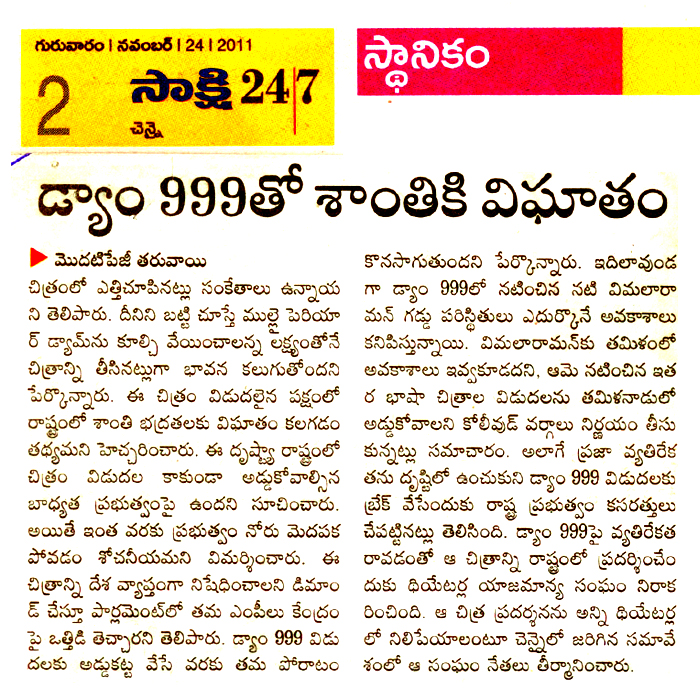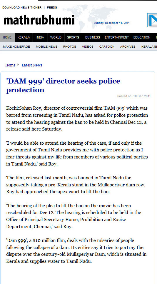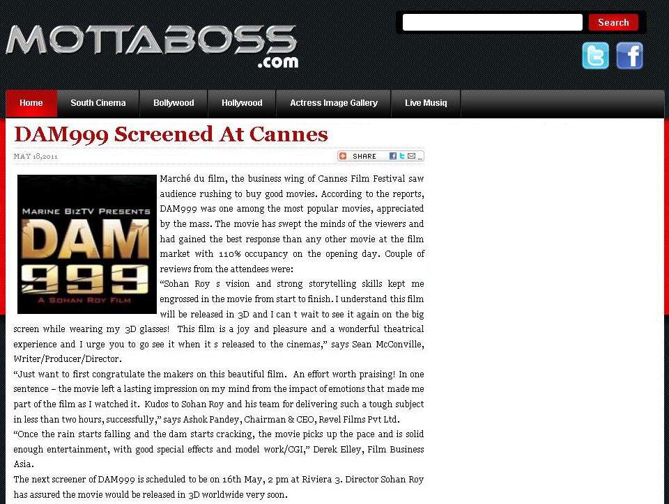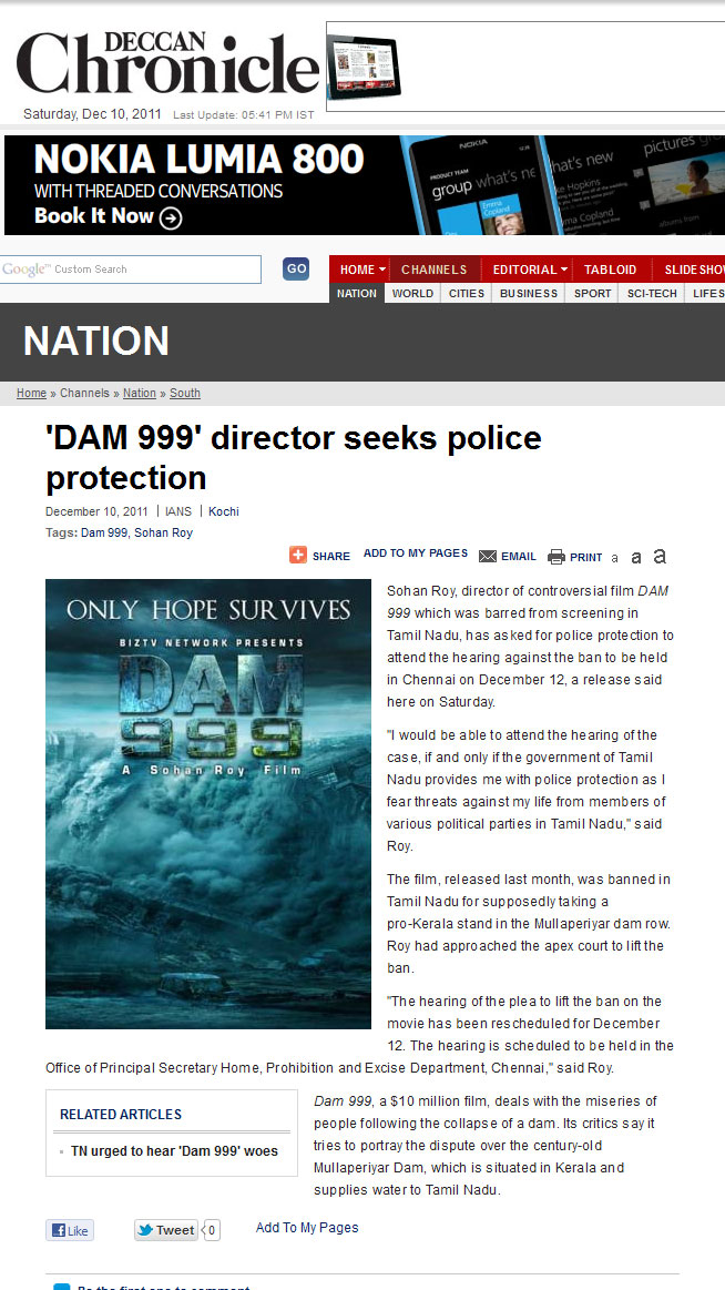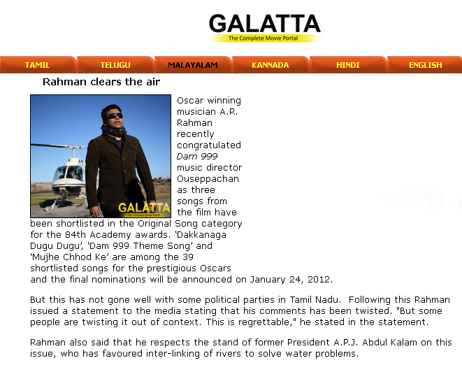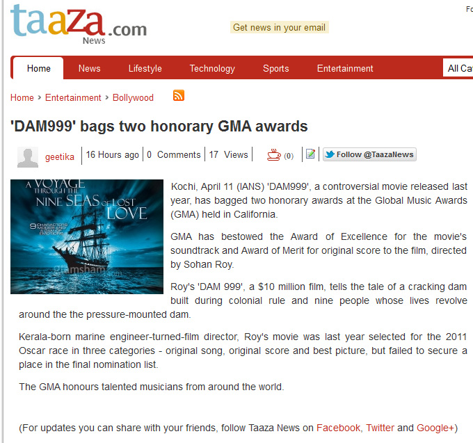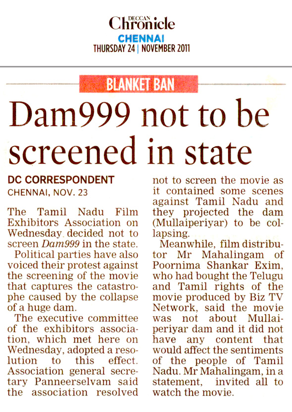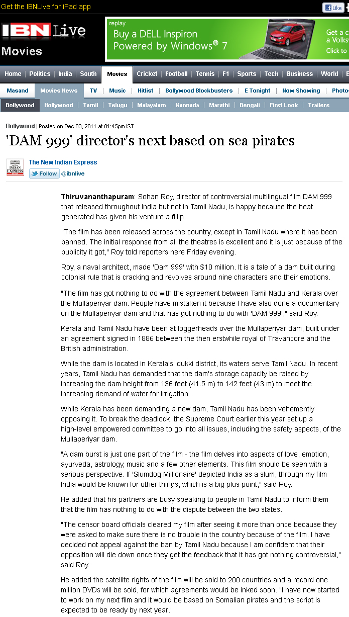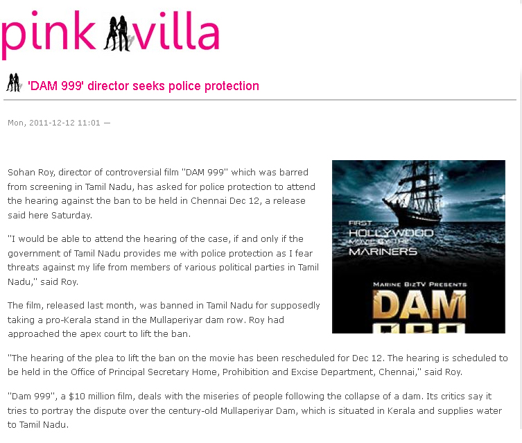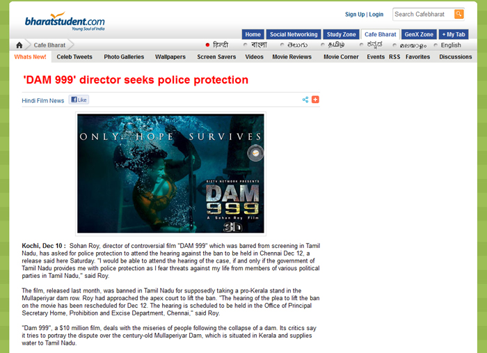 - Controversial 'DAM 999' makes to the ballot list for Oscars 2011 -Andhrawishesh.com