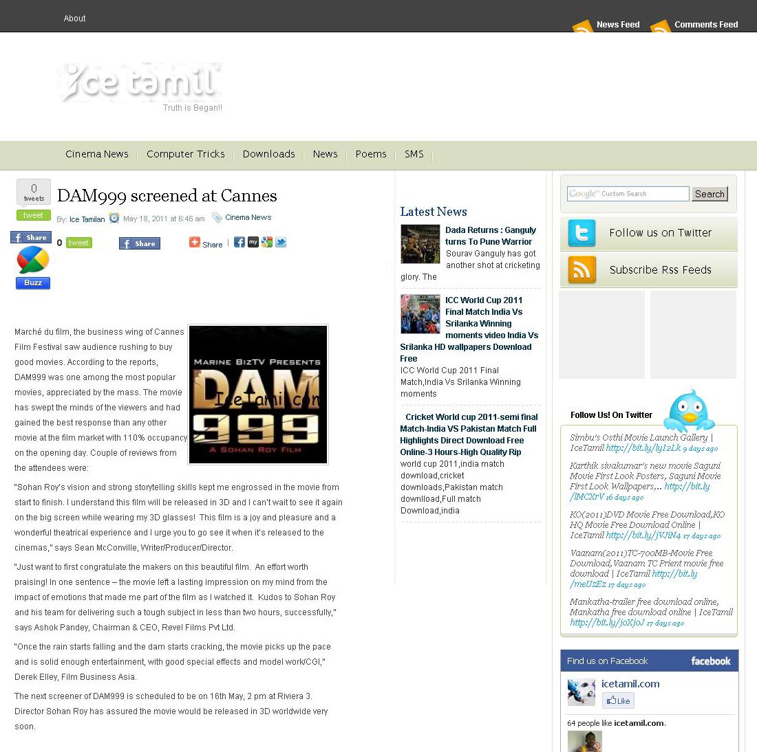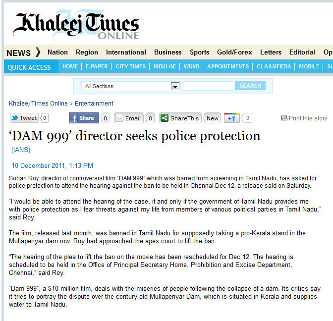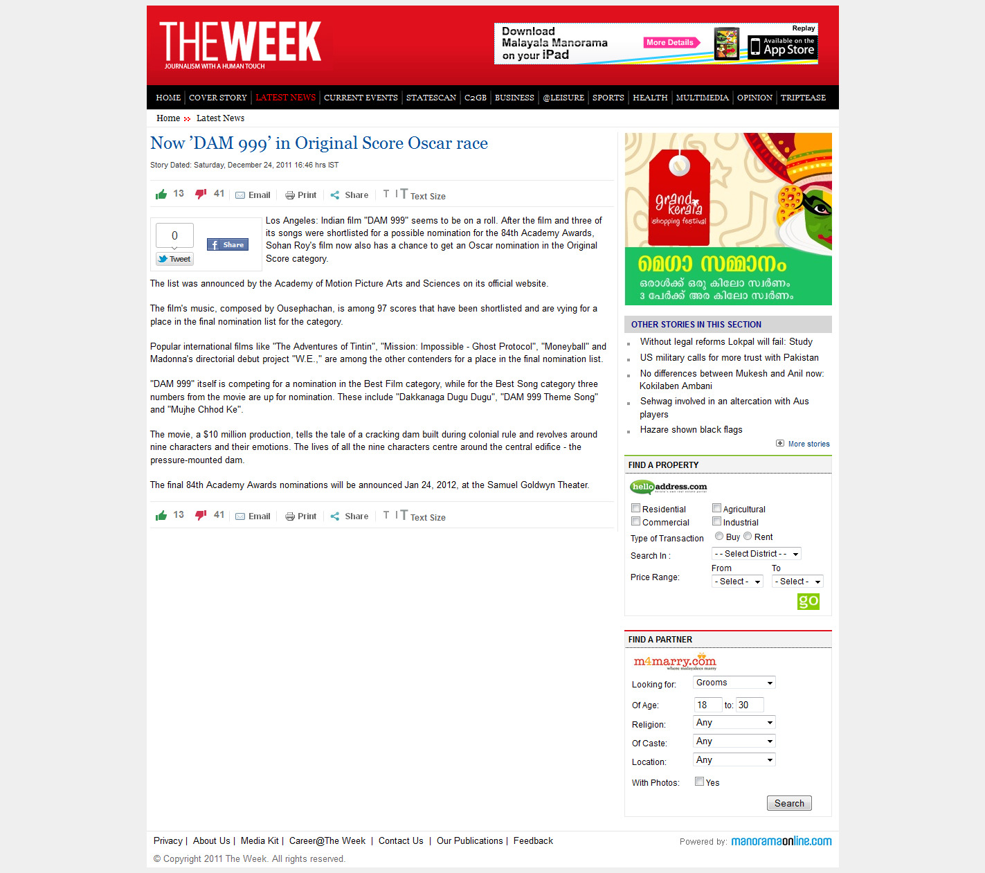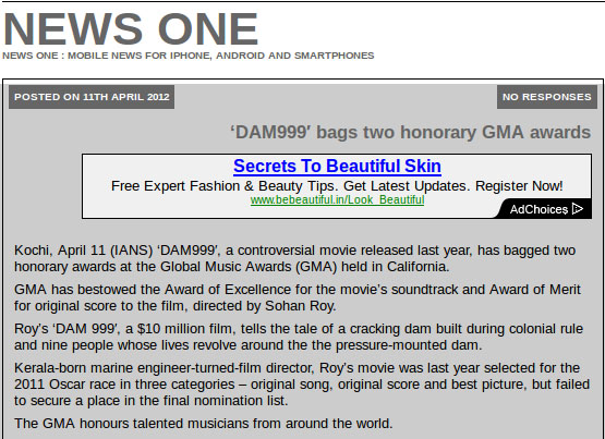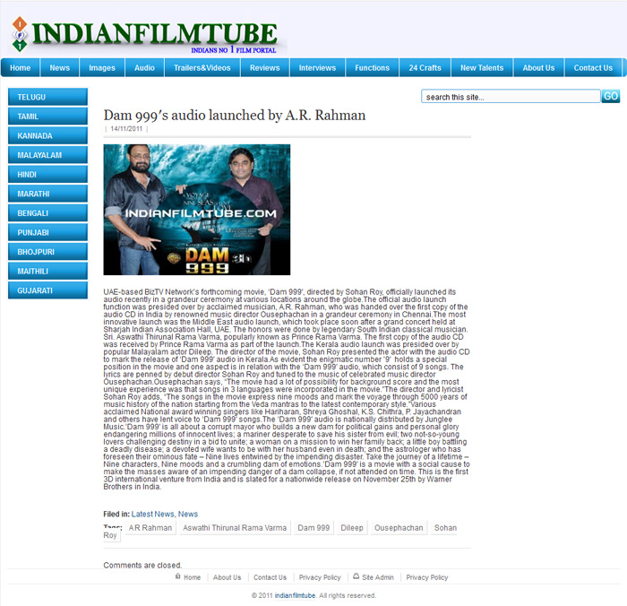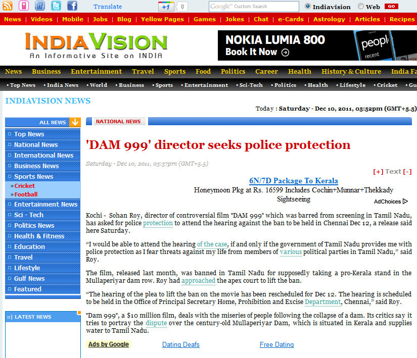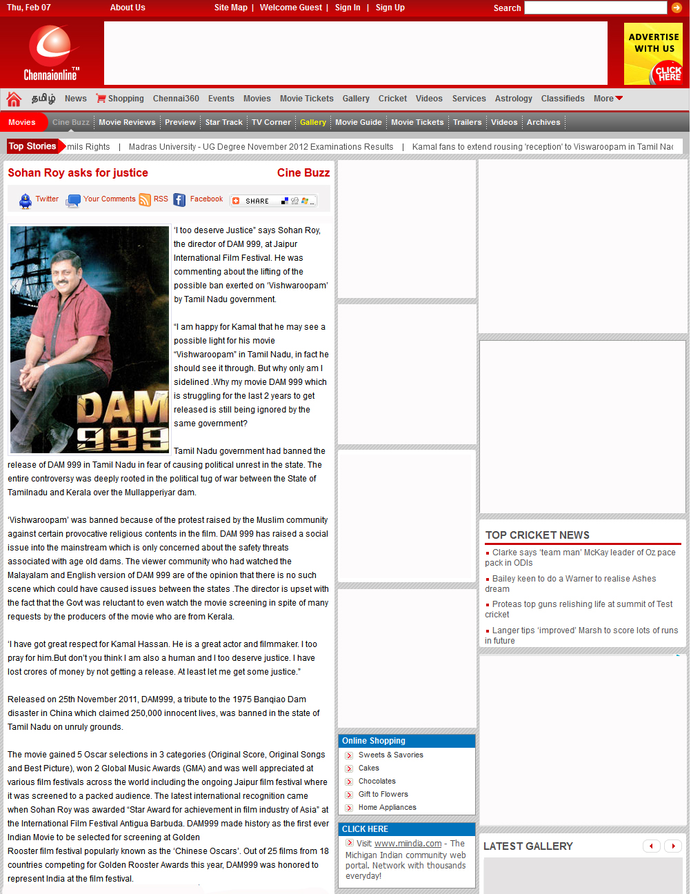 - Controversial 'DAM 999' makes to the ballot list for Oscars 2011 -Andhrawishesh.com