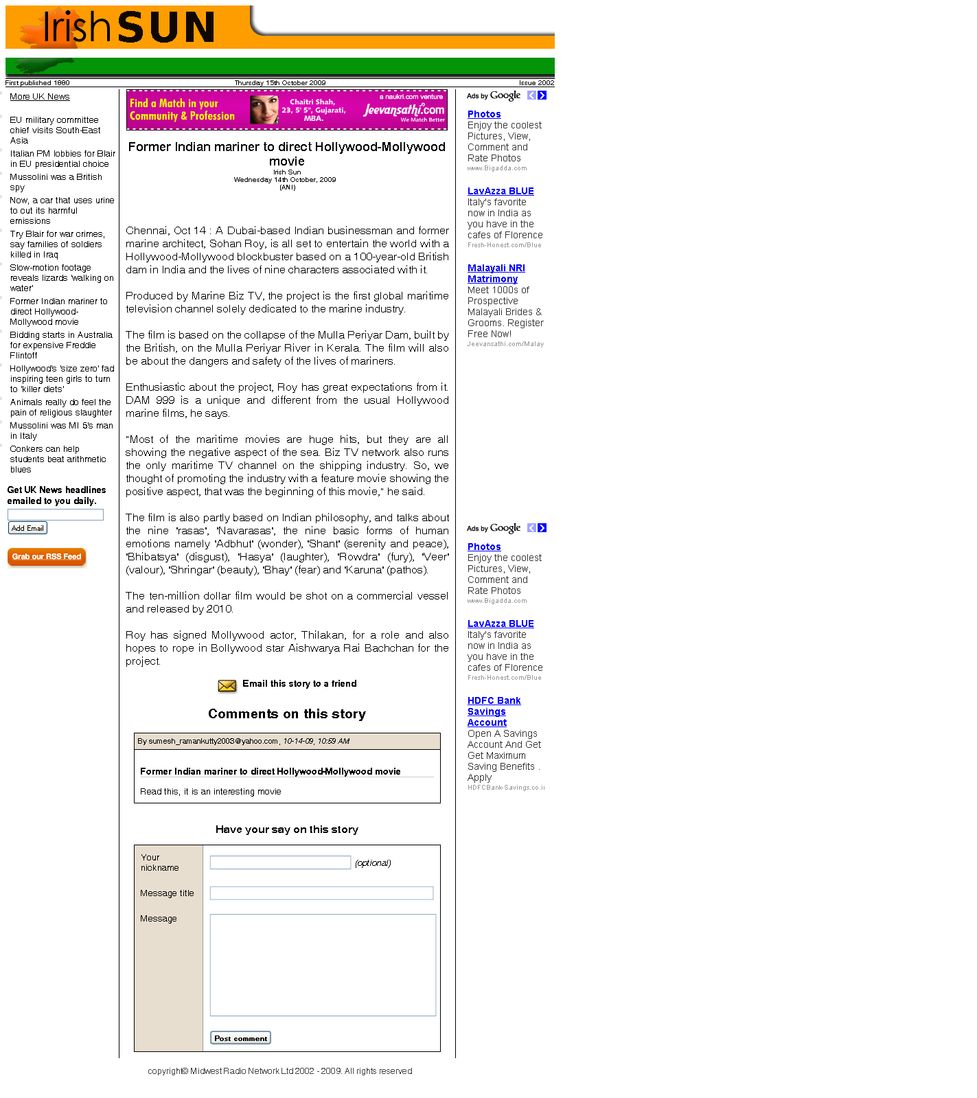 - Former Indian Mariner to direct Hollywood-Mollywood Movie -Irish Sun