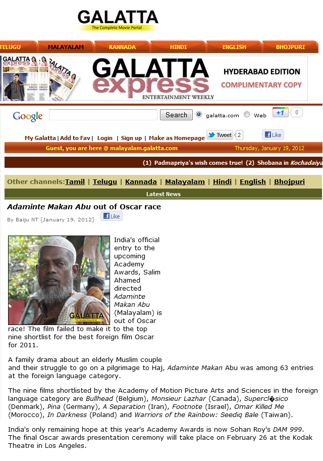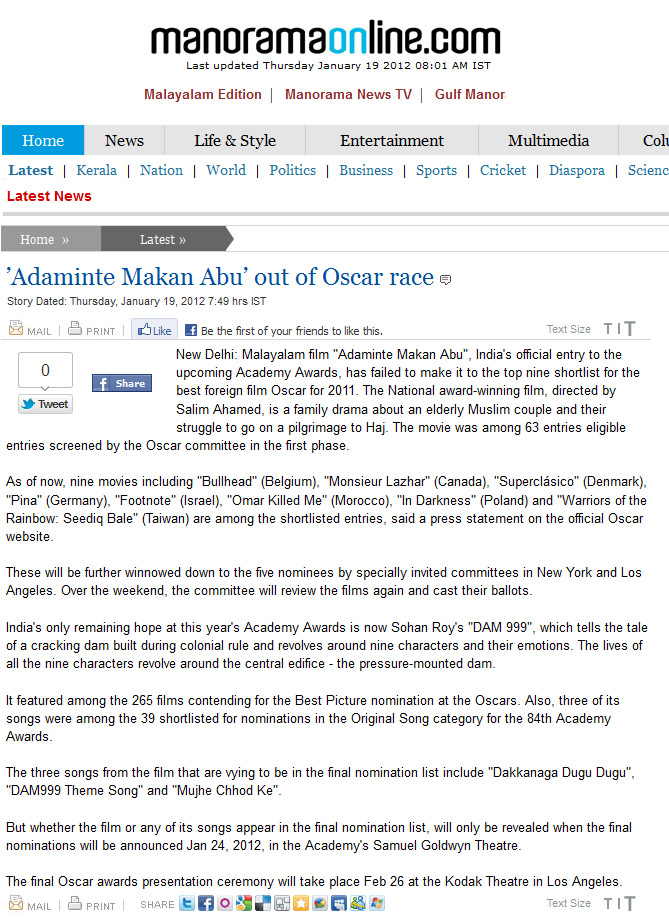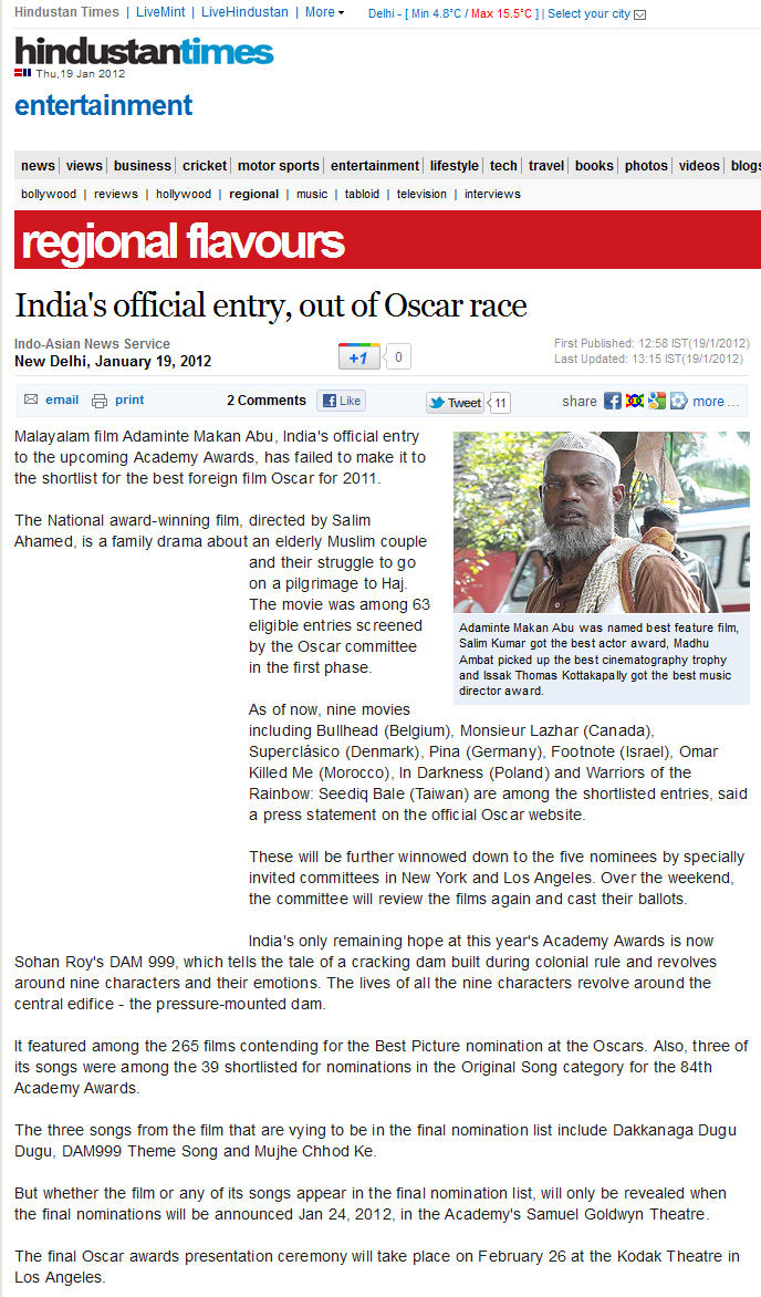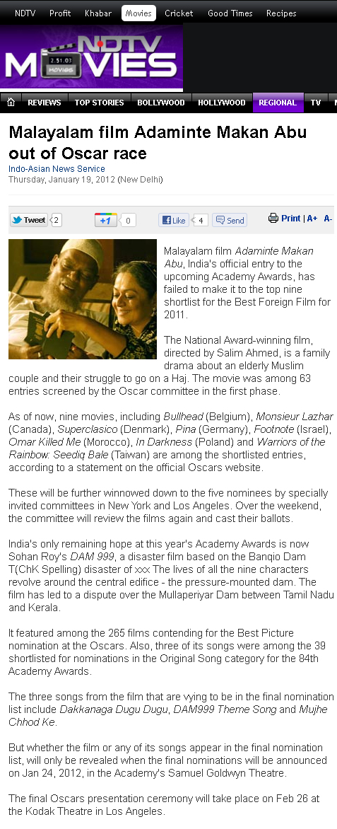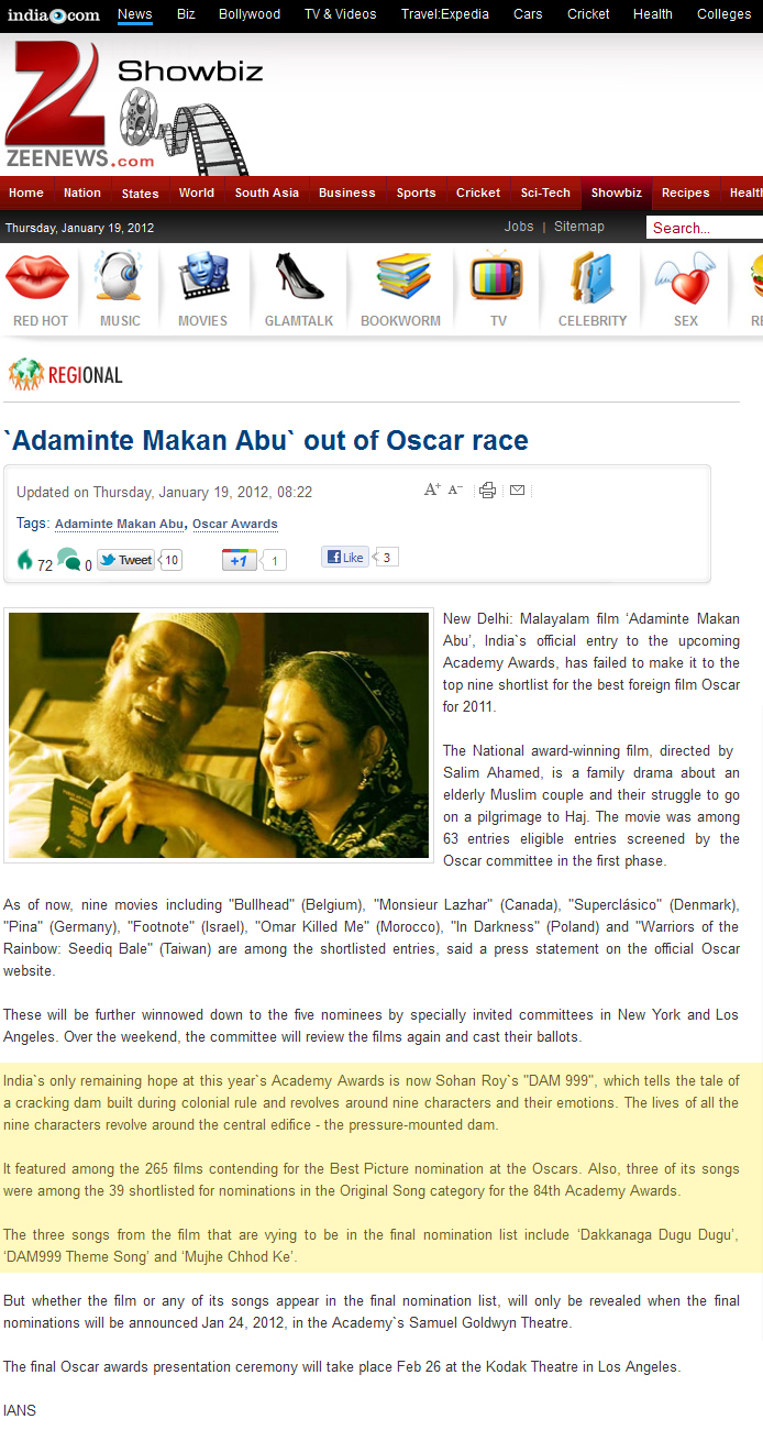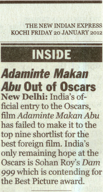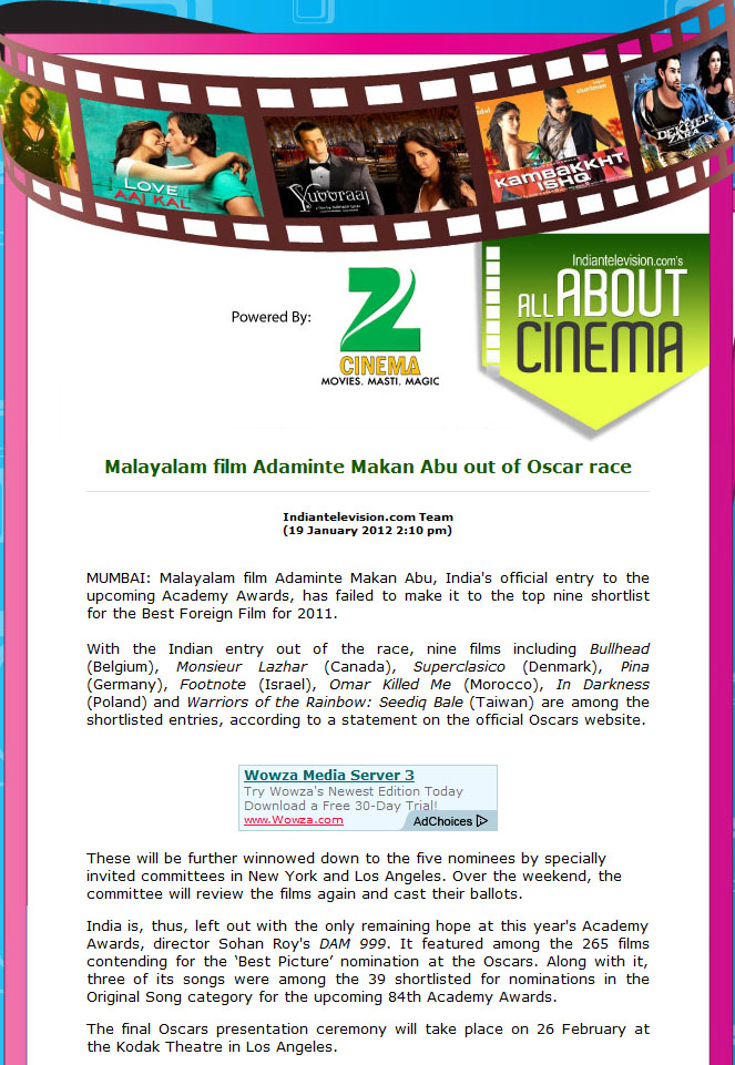 - Malayalam film Adaminte Makan Abu out of Oscar race -Indiantelevision.com