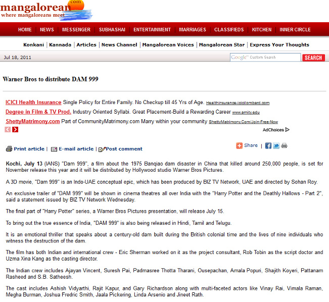 - Warner Bros to distribute DAM999 - Mangalorean.com