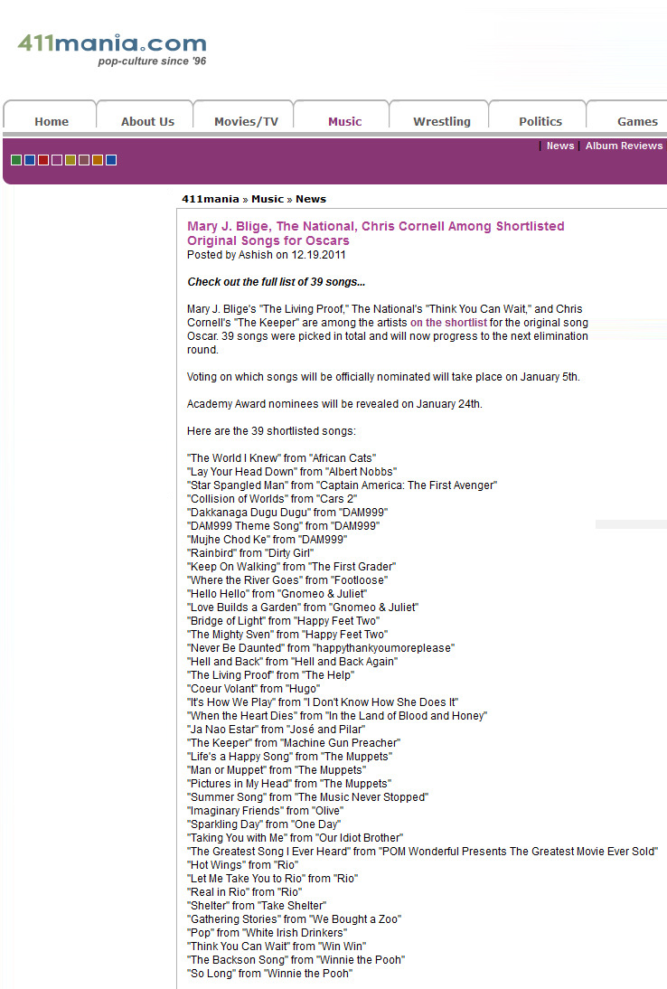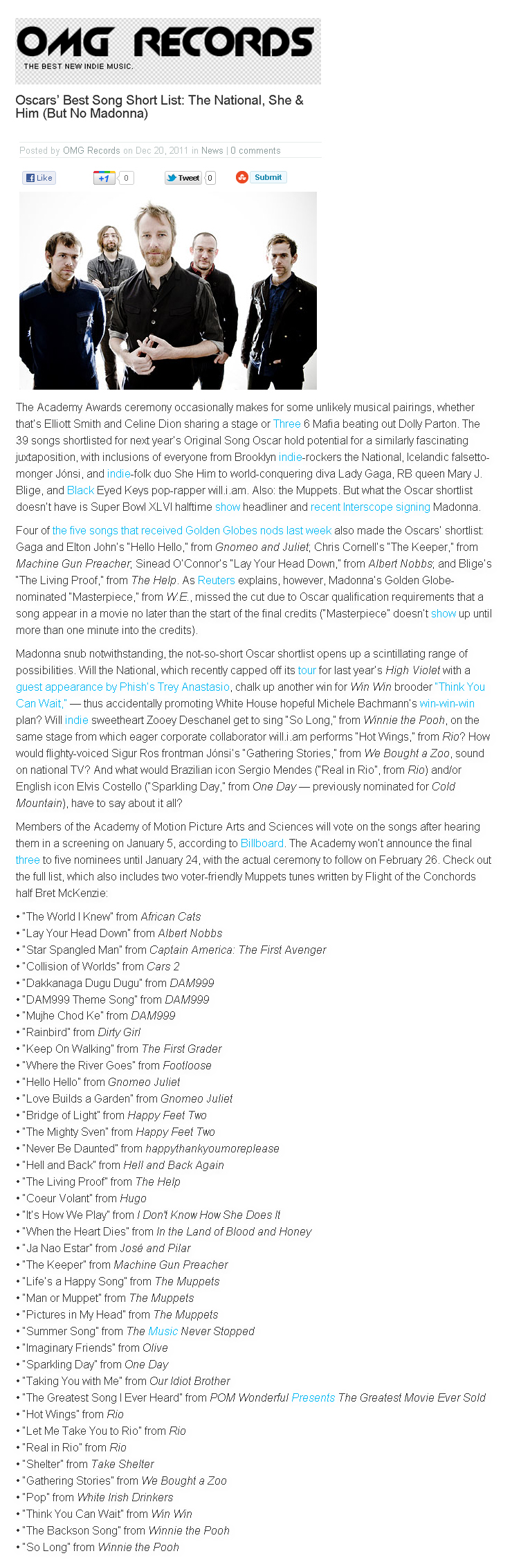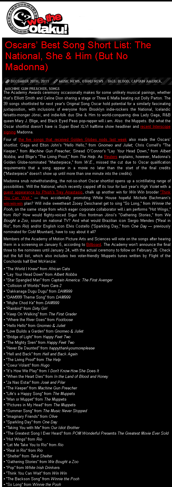 - Oscars' Best Song Short List: The National, She & Him (But No Madonna) -Wetheotaku.com
