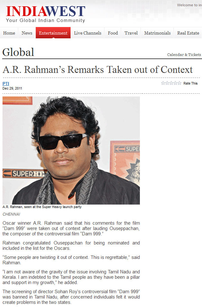 - Rahman wants to 'DAM999' to win Oscar - Indiaglitz.com