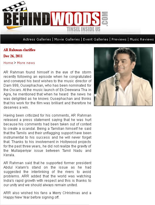- Rahman wants DAM999 to bring back the Oscars -Tamil.galatta.com