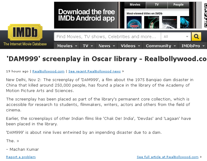 - 'DAM999' screenplay in Oscar library - Realbollywood.com