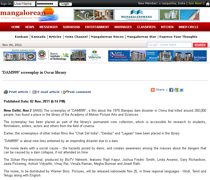 - DAM999' screenplay in Oscar library-Mangalorean.com
