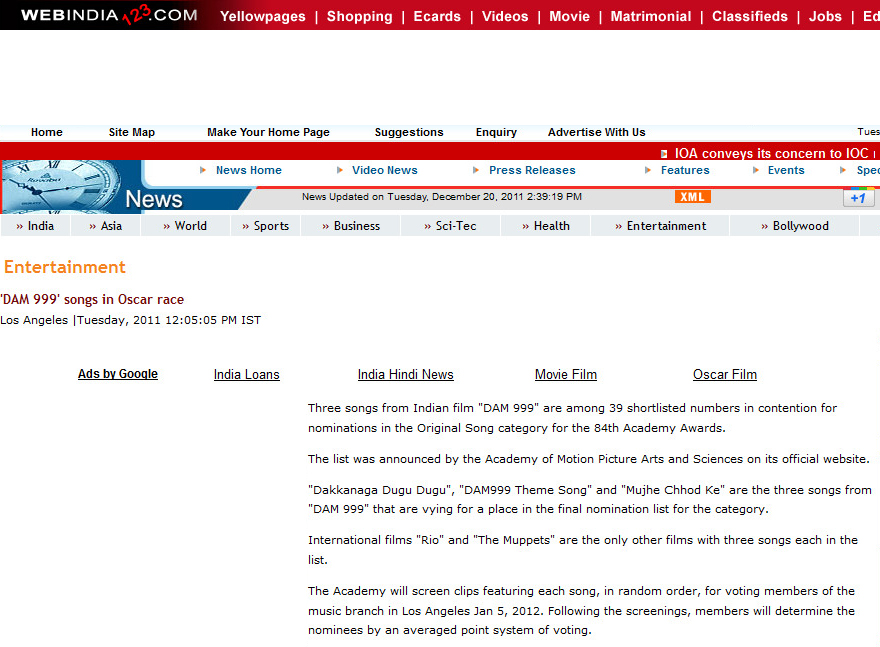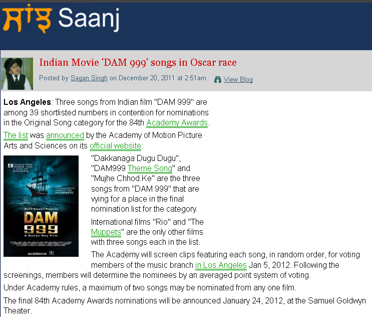 - 'DAM999' short listed for Oscar Award - Jaipur.com