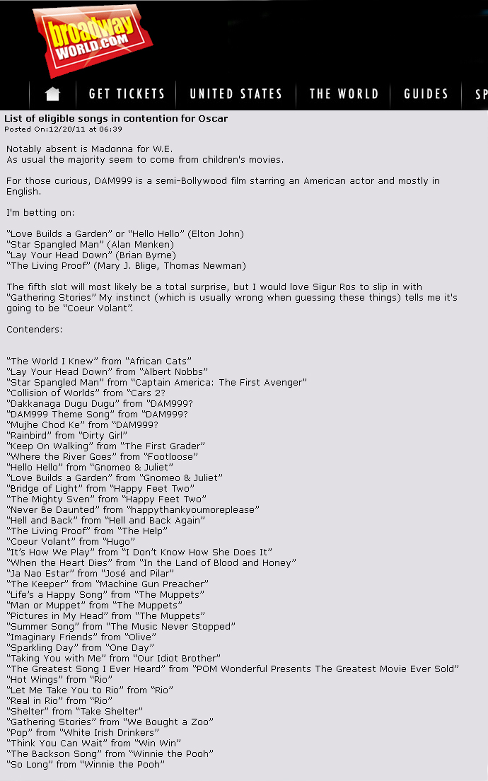 - List of eligible songs in contention for Oscar (BroadwayWorld.com)Broadwayworld.com
