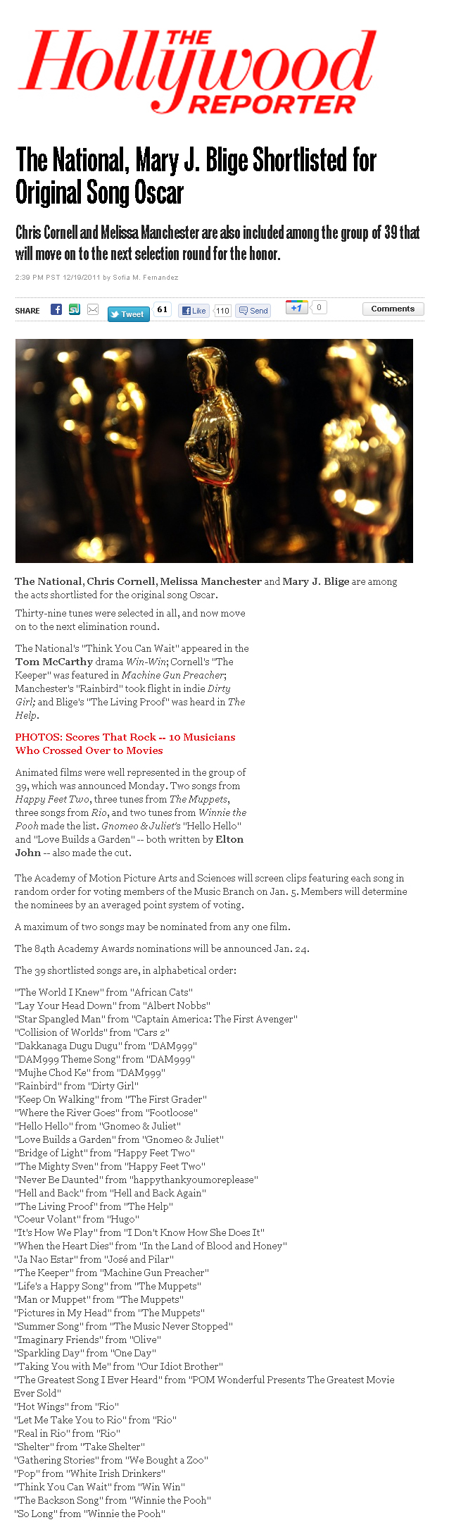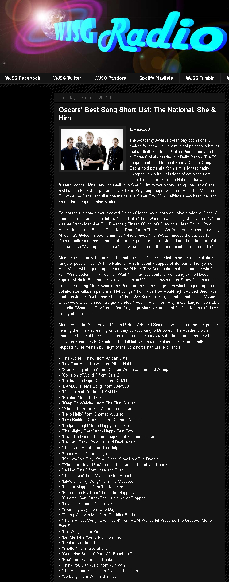 - Oscars' Best Song Short List: The National, She & Him -Wjsginternetradio.com
