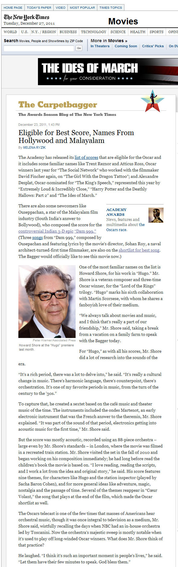 - Eligible for Best Score, Names From Hollywood and Malayalam -Carpetbagger.blogs.nytimes.com
