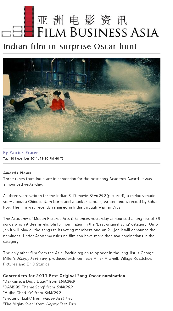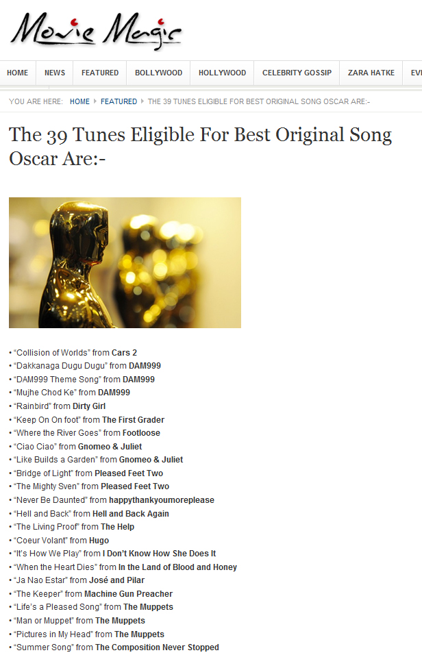 - 3 songs from DAM999 nominated for Oscars -Supergoodmovies.com