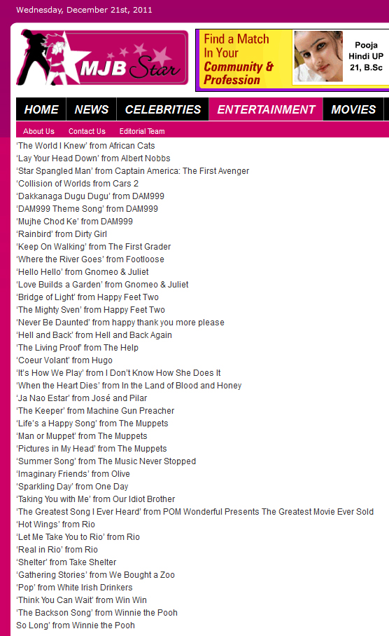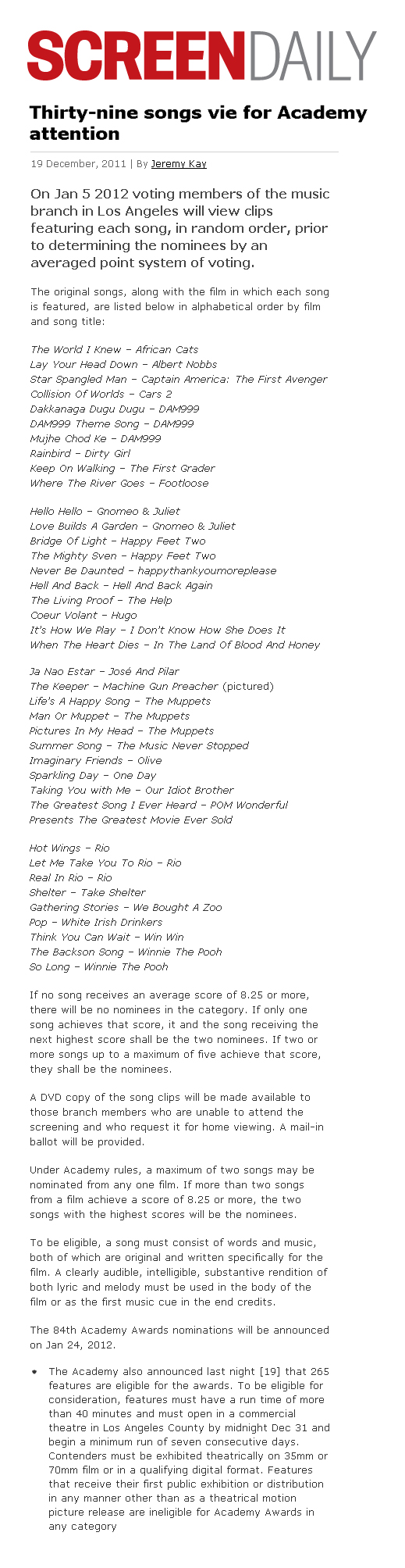 - Thirty-nine songs vie for Academy attention - -Screendaily.com