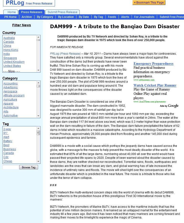 - DAM999 - A tribute to the Banqiao Dam Disaster - PR Log