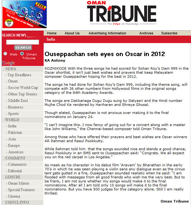 - Ouseppachan sets eyes on Oscar in 2012 - Omantribune.com